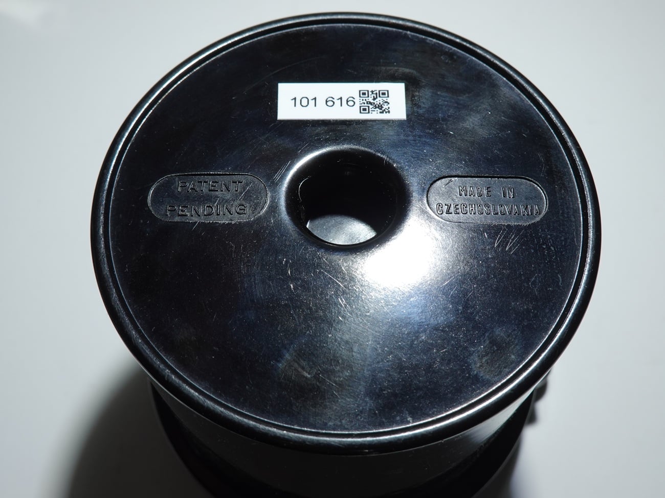 Entwicklungsdose für den Rollfilm 120, aus Bakelit, Made in Czechoslovakia, wahrscheinlich vor 1939.