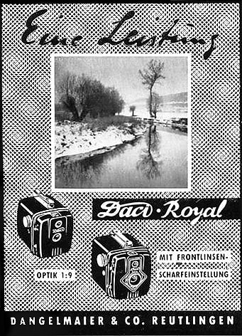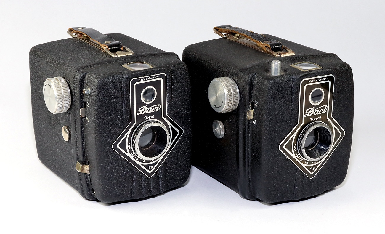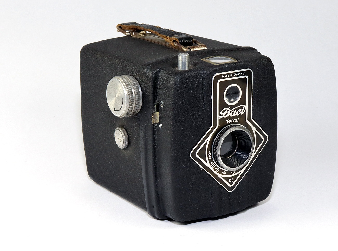 Boxkamera (1950) aus Metall für den Rollfilm 120/620/B2 (Aufnahmeformat 6 x 6 cm), manuelle Scharfstellung,  Einfachverschluss (Zeit und Moment), manuelle Belichtungssteuerung, Frontlinseneinstellung (1,5 Meter bis unendlich), Drahtauslöseranschluss, Traggriff, verschließbares Filmfenster, Lichtstärke: 1:9,0.