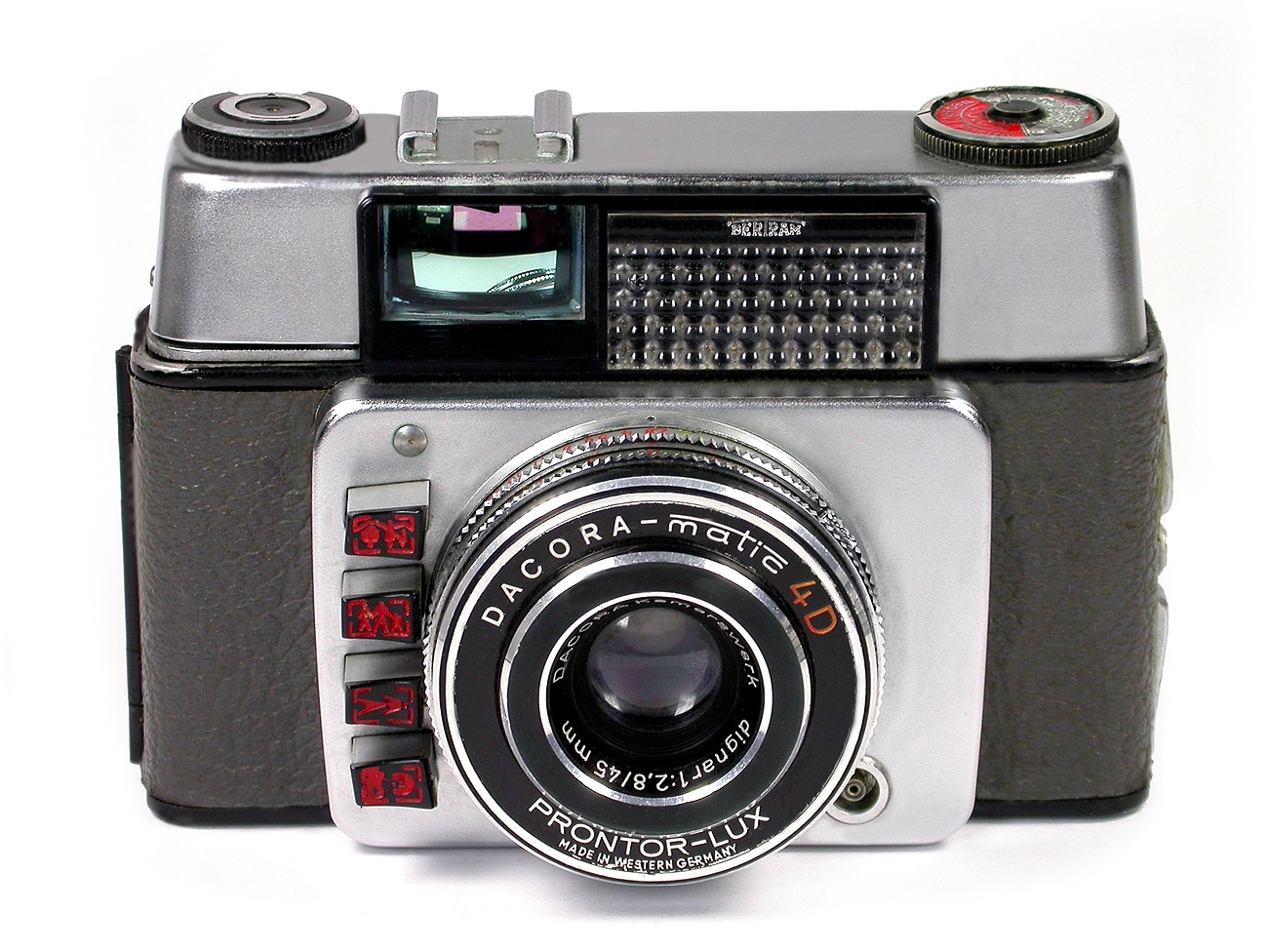 Sucherkamera für den Kleinbildfilm 135 (Aufnahmeformat 24 x 36 mm), hergestellt zwischen 1960 und 1966. Objektiv: Dacora Dignar 1:2,8/45 mm; Zentralverschluss Prontor-Lux, Integralmessung, verspiegelter Sucher, Bertram-Belichtungsmesser Funktionsweise und weitere Daten (laut Prospekt von 1960): „Die Dacora-matic 4 D ist der erste Drucktasten-Automat in der Photographie, bei dem jede der vier Bedienungstasten neben der Belichtungsregelung auch die Optikeinstellung und die Verschlussauslösung übernimmt. Die Bewegung des Schalthebels und das Drücken einer der vier mit Motivsymbolen versehenen Tasten sind die einzigen notwendigen Bedienungsmaßnahmen für die Aufnahme.