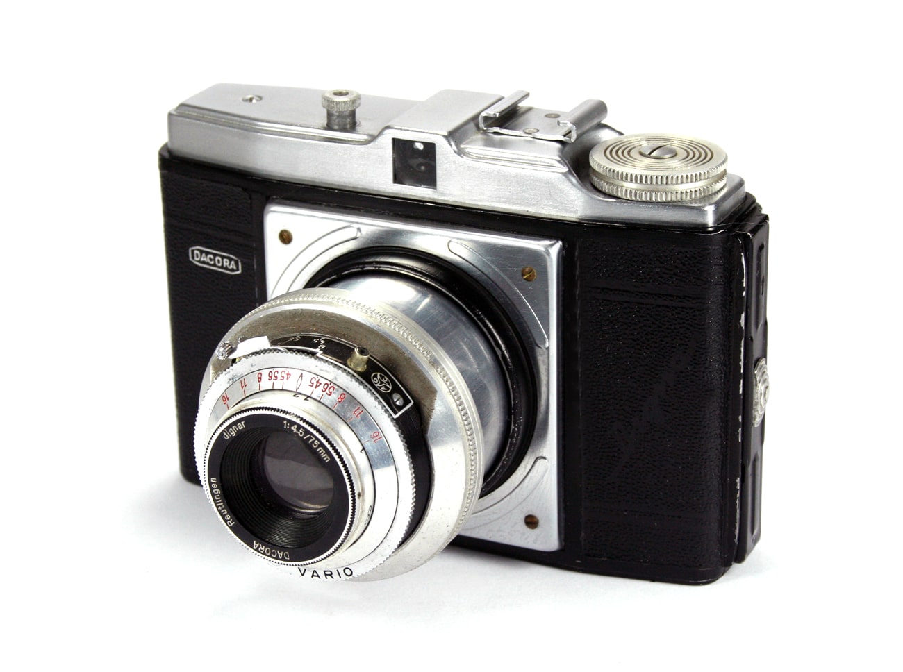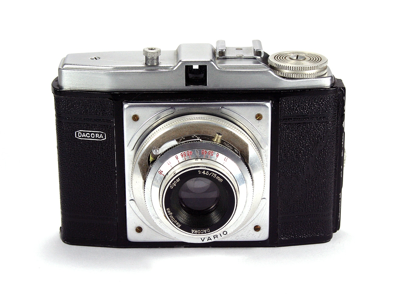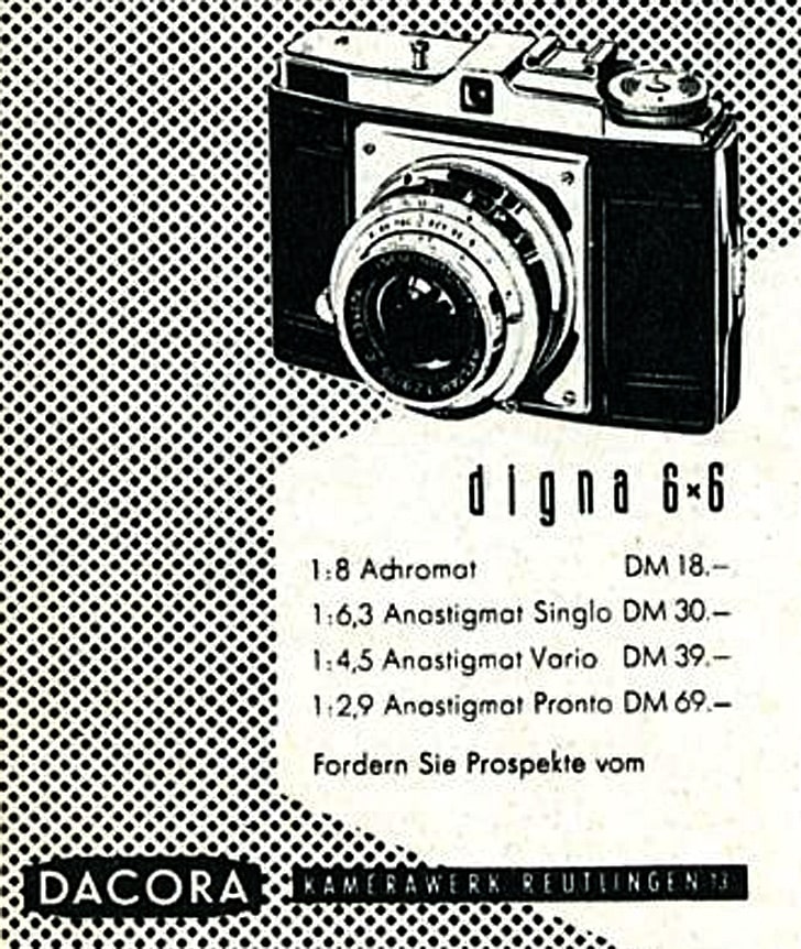 Sucherkamera für den Rollfilm 120 (Aufnahmeformat 6 x 6 cm) mit versenkbarem Tubus, hergestellt ab 1954, hier mit der zweitbesten lieferbaren Ausstattung. Objektiv: Dacora Reutlingen Dignar 1:4,5/75 mm, manuelle Scharfstellung; Zentralverschluss Vario (bis 1/200 Sekunde), manuelle Belichtungssteuerung; Blitzsynchronkontakt, Gehäuseauslöser mit Drahtauslöseranschluss, Zubehörschuh.