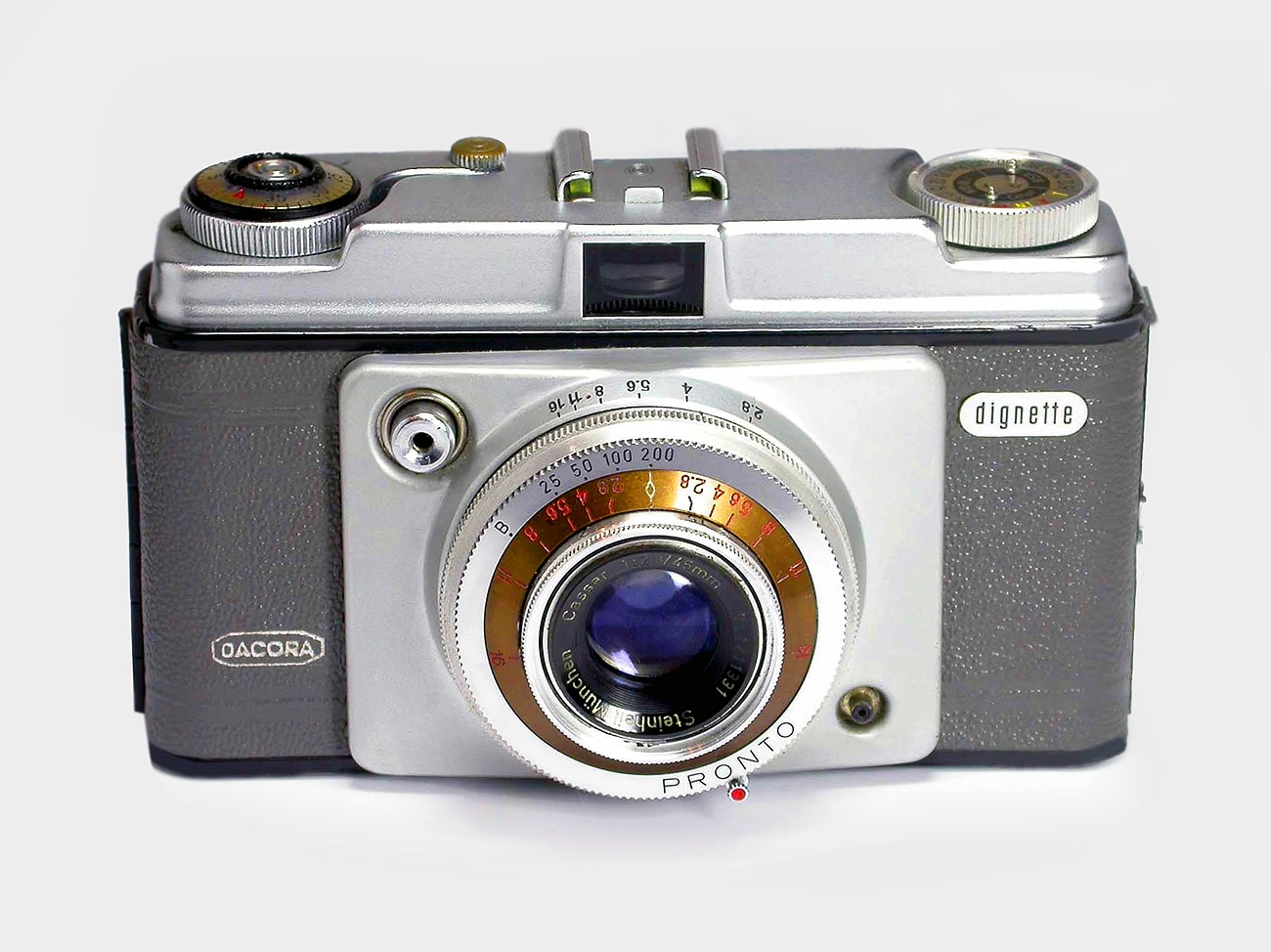 Sucherkamera für den Kleinbildfilm 135 (Aufnahmeformat 24 x 36 mm), hergestellt ab 1960 in Reutlingen bei Dacora (Firmengründer: Bernhard Dangelmaier; Firmennamen: bis 1954 Dangelmeier & Co., danach DACO – Dangelmeier & Co., ab 1960 Dacora-Kamerawerk Dangelmeier & Co. und von 1969 bis 1972 Dacora-Kamerawerk GmbH). Genauer Typ: Dignette Pronto olivgrau; offenbar selten: Objektiv Steinheil München Cassar 1:2,8/45 mm; Verschluss: Pronto (B, 1/25 bis 1/200 Sekunde), mit Selbstauslöser. Schnellspannhebel, Zubehörschuh, Filmmerkscheibe auf dem Rückspulrad. Gehäuseauslöser mit Drahtauslöseranschuss; der Auslöser wird nach hinten bewegt, was ein Verwackeln der Fotos verhindern soll.