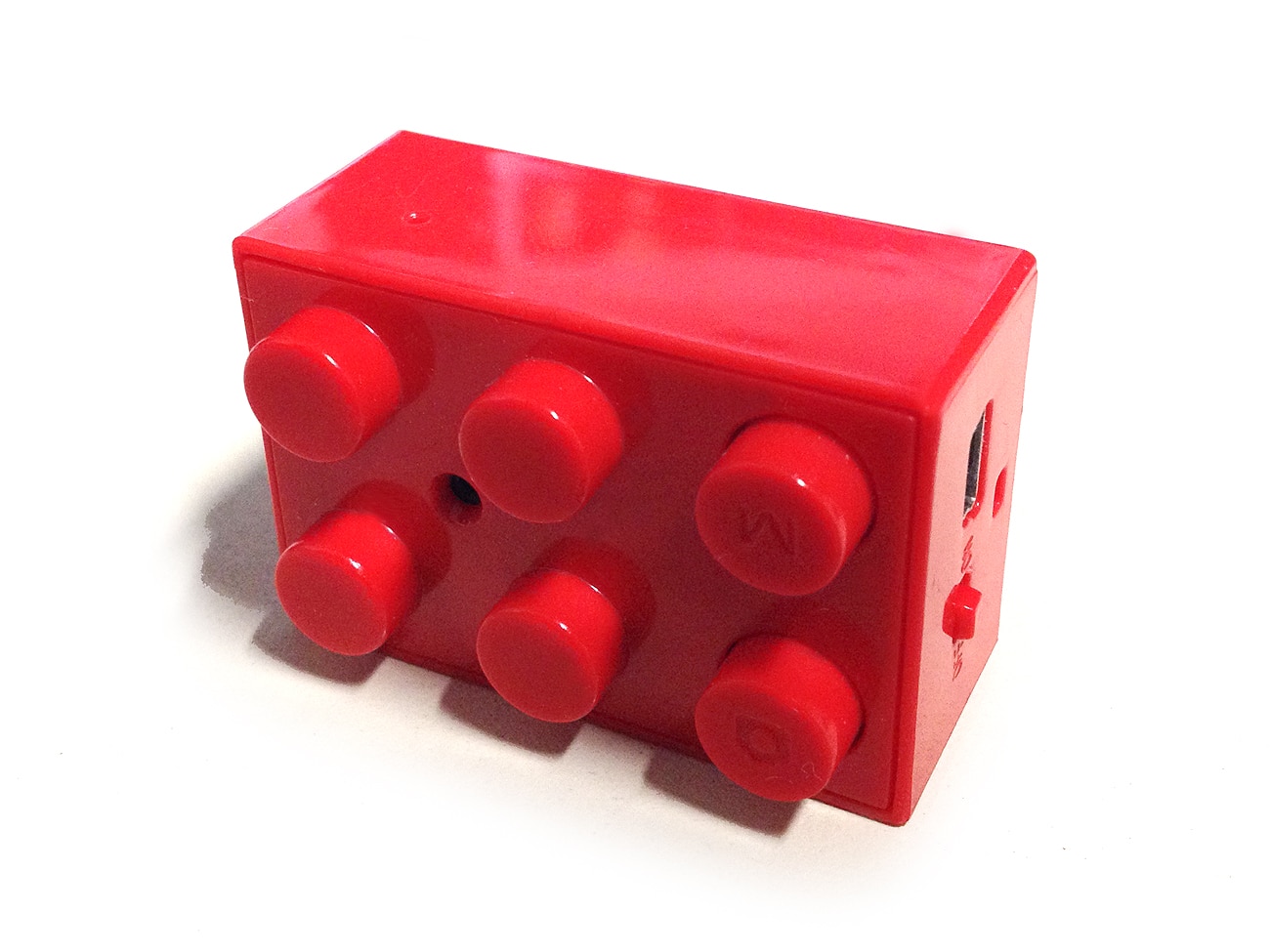 Sieht aus wie ein DUPLO-Stein (der große Bruder des LEGO-Steins), lässt sich auch mit anderen DUPLOS verbauen, aber es ist eine digitale Kamera mit ganz brauchbaren Eigenschaften – jedenfalls ein nettes Spielzeug, das in SW Bilder oder Videos (mit Ton) macht, das Ganze auf Wunsch auch in Farbe. Rechts der Ein-/Aus-Schalter und der Mini-USB-Anschluss. Zwei der sechs Noppen sind als Knöpfe zur Bedienung der Kamera gestaltet. Die Speicherkarte ist wechselbar.