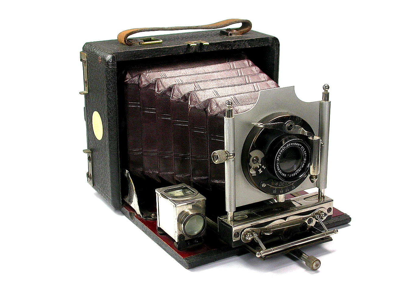 Plattenkamera für das Format 9 x 12 cm von Dr. Rudolf Krügener, Bockenheim/Frankfurt am Main, etwa 1900 oder etwas später. Edelholz, schwarz beledert, roter Lederbalgen. Delta-Verschluss. Objektiv: Universal-Aplanat „Deminar“ 1:7,7/135 mm, Seriennummer 25202. Blenden bis 36. Laufbodenkonstruktion mit doppeltem Auszug. Scharfstellung per Schneckengang über die Schraube vorne Mitte. Für den Wechsel von quer- zu hochformatigen Aufnahmen schwenkbarer Brillantsucher (links unten im Bild).