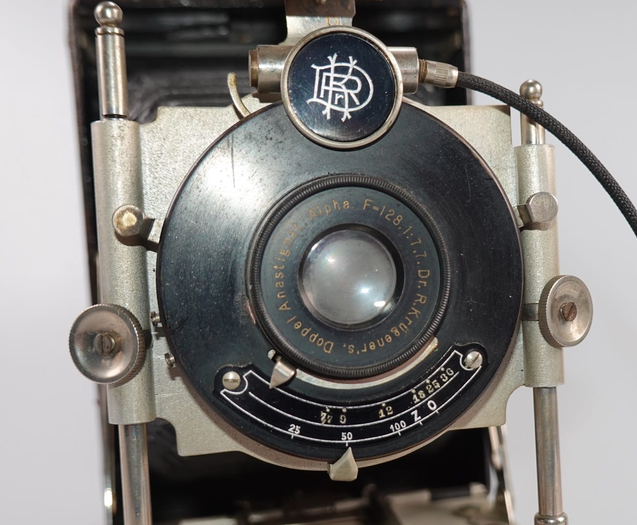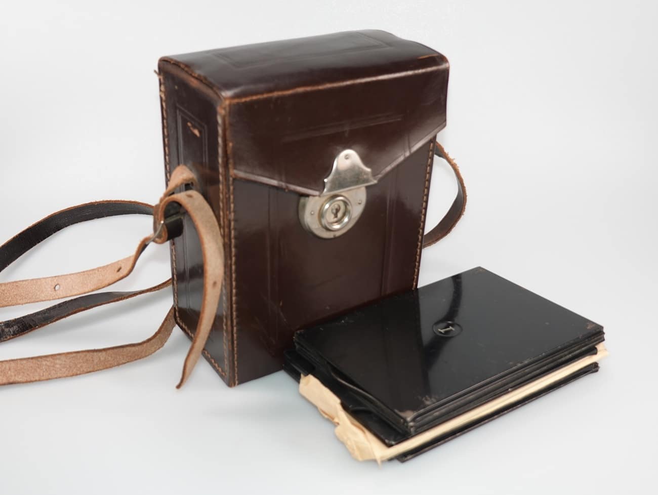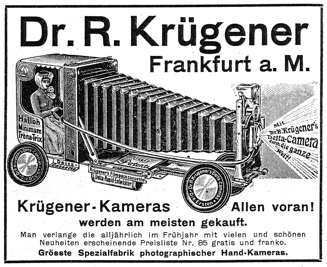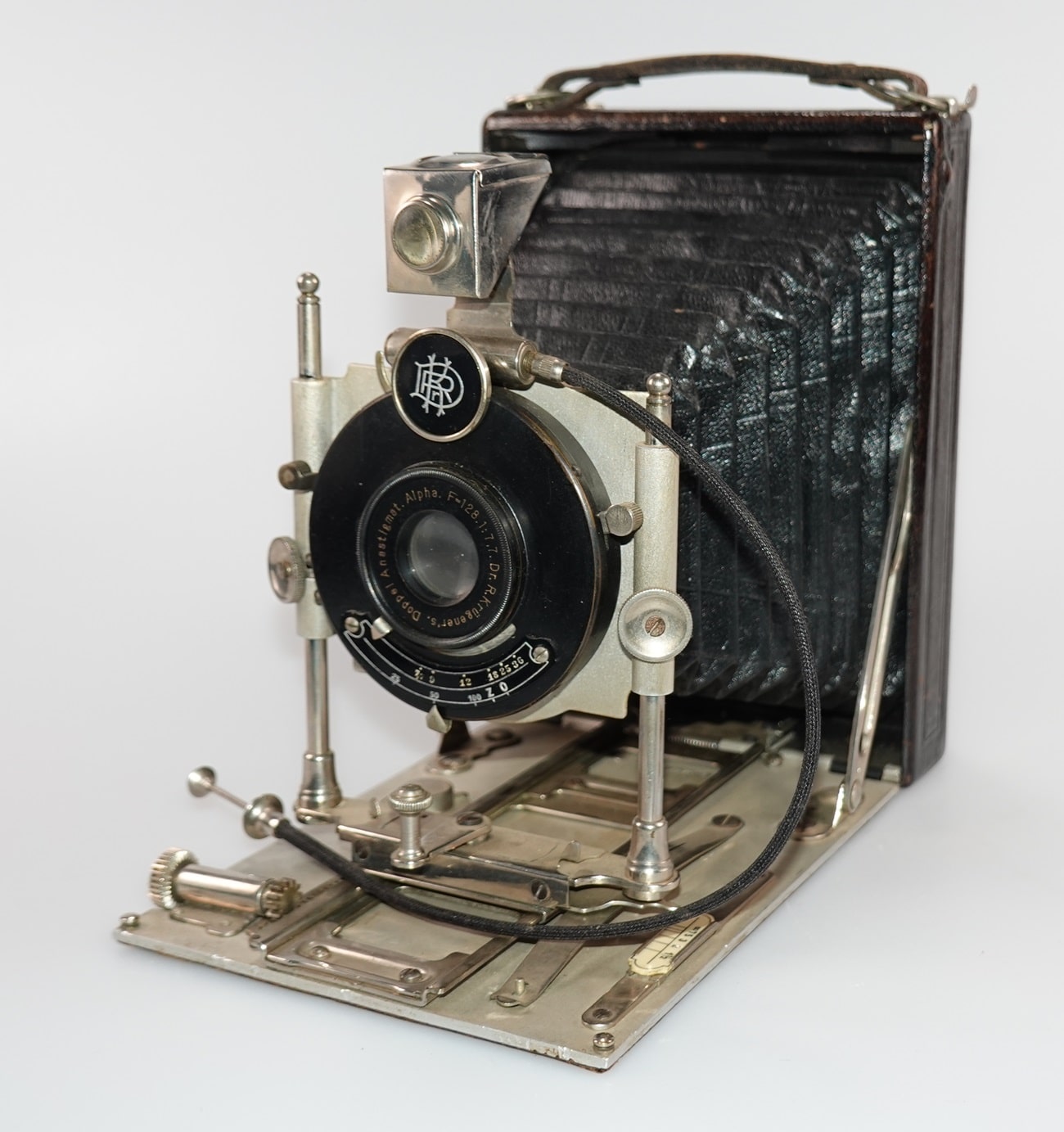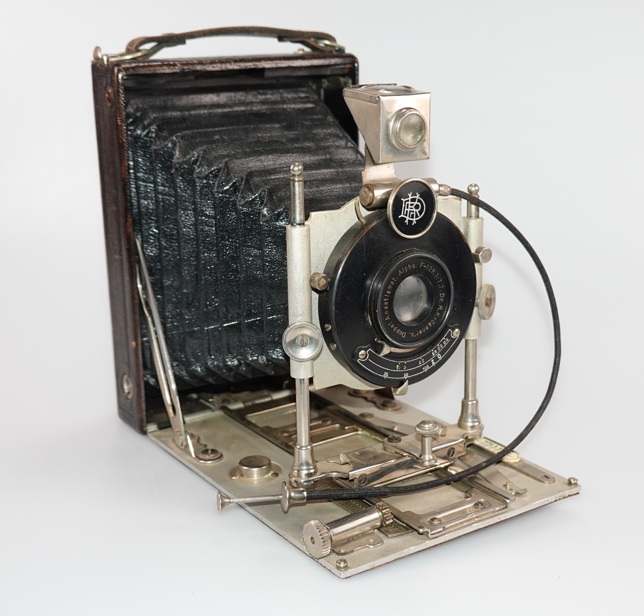 Klapp-/Laufbodenkamera aus Metall für Platten (Aufnahmeformat 9 x 12 cm). Gehäuse nicht gemarkt. Objektiv: Dr. R. Krügener’s Doppel-Anastigmat Alpha 1:7,7/128 mm; manuelle Fokussierung über den Laufboden. Schwenkbarer Brillantsucher. Mechanischer Zentralverschluss (1/25, 1/50, 1/100 Sekunde, Z, 0); manuelle Belichtungssteuerung. Mit Ledertasche und fünf Plattenkästen.