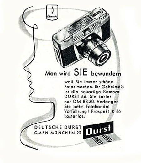 Aus einer Werksmitteilung von 1956: „Man sieht schon am Äußeren dieser Kamera die Verwandtschaft mit den durch modernen Aufbau und Dauerpräzision in aller Fachwelt berühmten Durst-Vergrößerungsgeräten. Das Problem der richtigen Belichtung und das verwirrende Wechselspiel: Blende-Belichtungszeit sind nach wie vor jene Hürden, die viele von der Photographie abschreckt. Deshalb besitzt die Durst 66 lediglich zwei Blendeneinstellungen, die nicht durch Zahlen, sondern durch unmittelbar anschauliche Symbole markiert sind.
