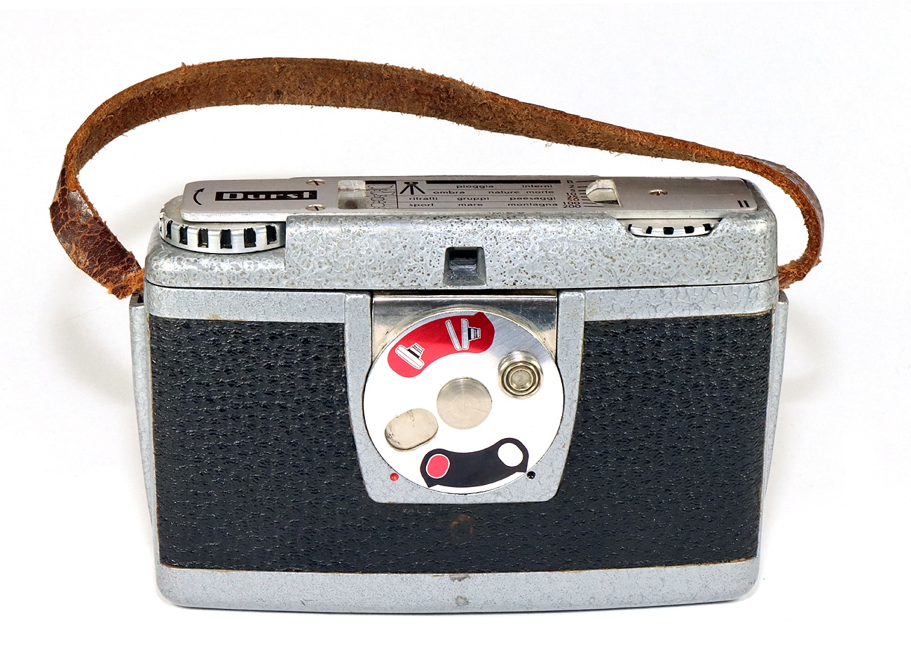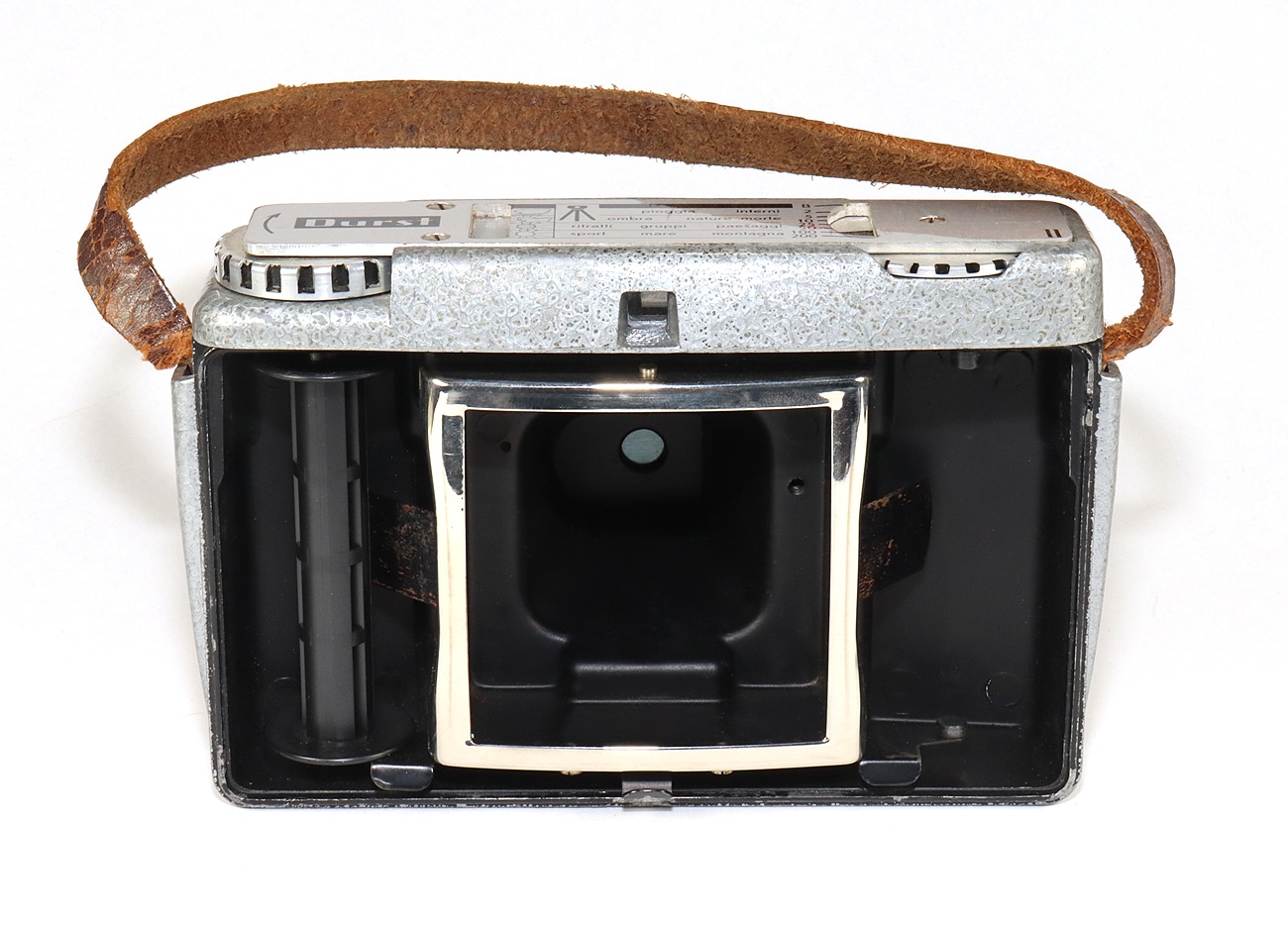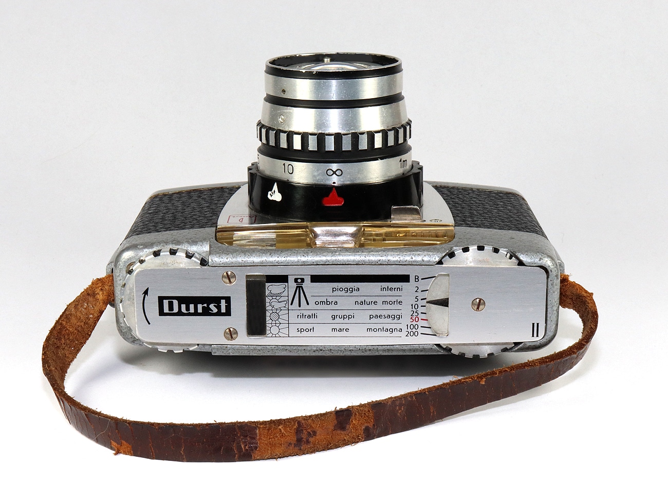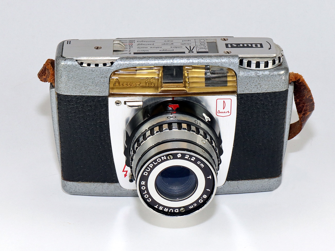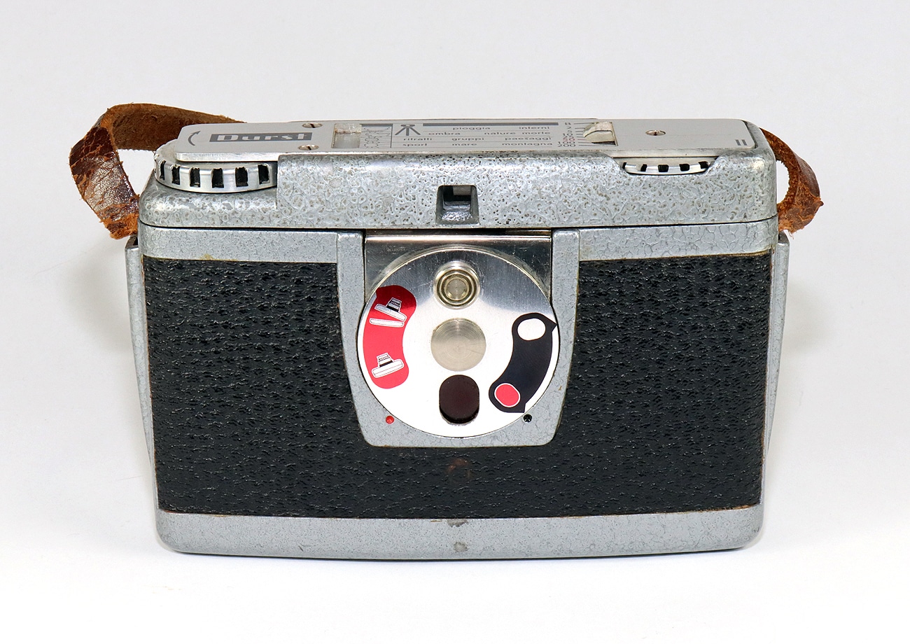Seltene und ungewöhnlich konstruierte Sucherkamera (1956) für den Rollfilm 120 der italienischen Firma Durst, die hauptsächlich durch ihre Vergrößerungsgeräte berühmt wurde. Aufnahmeformat 6 x 6 cm. Mechanischer Zentralverschluss (B, 1/2 bis 1/200 Sekunde), Integralmessung, manuelle Belichtungssteuerung. Objektiv: Durst Color Duplon 1:2,8/80 mm.