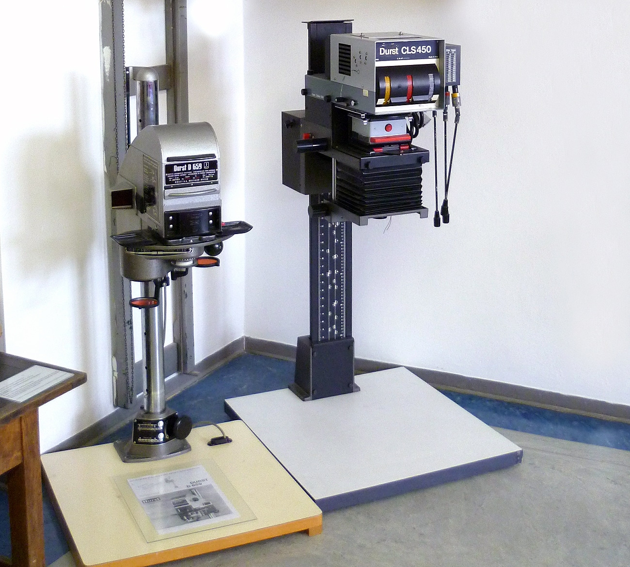 Zwei Prunkstücke der Firma Durst aus der umfangreichen Vergrößerer-Sammlung des Deutschen Kameramuseums: Rechts ein nahezu neuwertiger stabiler Profi-Farbvergrößerer Durst Laborator 1200 mit Farbmischkopf CLS 450 und Bildbühne Bimaneg (für Rollfilme bis 6 x 9 cm Negativformat). Grundsätzlich ist mit anderen Bildbühnen die Vergrößerung von Negativen bis 12,5 x 12,5 cm möglich. Verwendet werden können Objektive mit Brennweiten von 28 bis 150 mm. Maximale Höhe (Gerätekopf in oberster Stellung): 1,50 Meter, Nutzfläche des Grundbretts: 64 x 57 cm. Leistungsaufnahme: etwa 300 Watt. Der Laborator 1200 war im Labor Stenmans in Düsseldorf beheimatet.