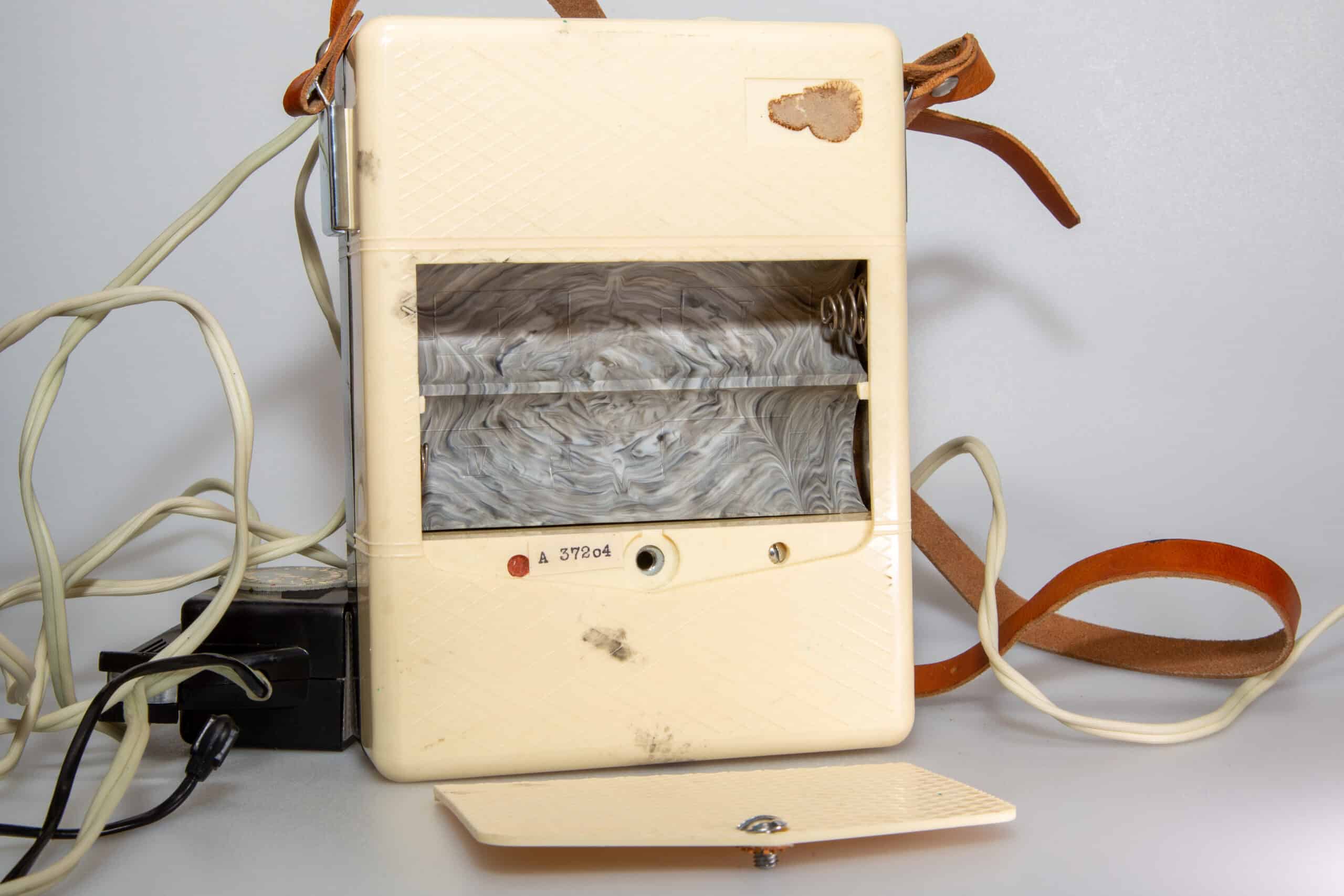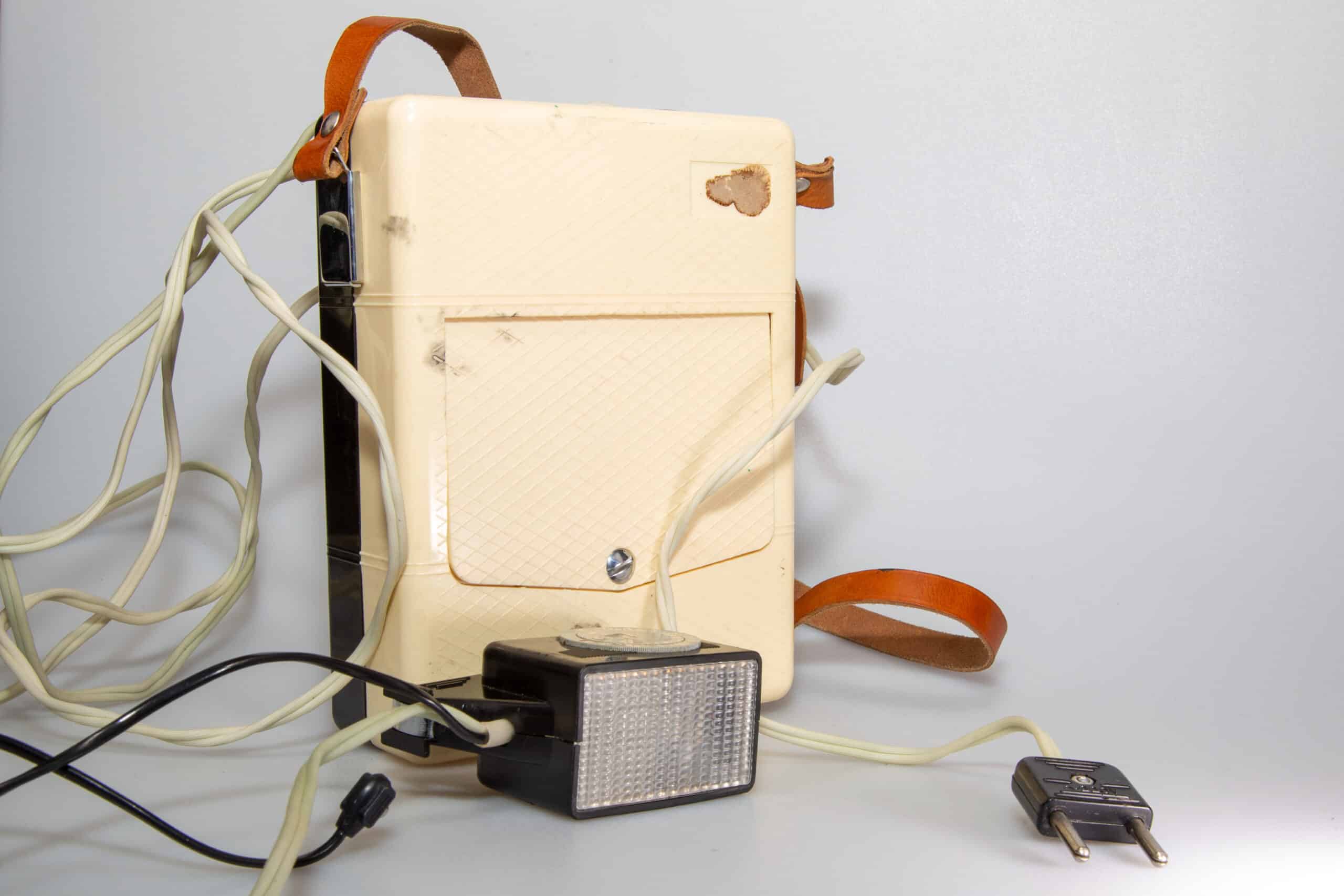 Elektronenblitz mit separatem Batteriekasten zum Umhängen. Nach den Beschriftungen aus sowjetischer Produktion, wahrscheinlich aus den 1960er Jahren. Mit Netzanschluss.