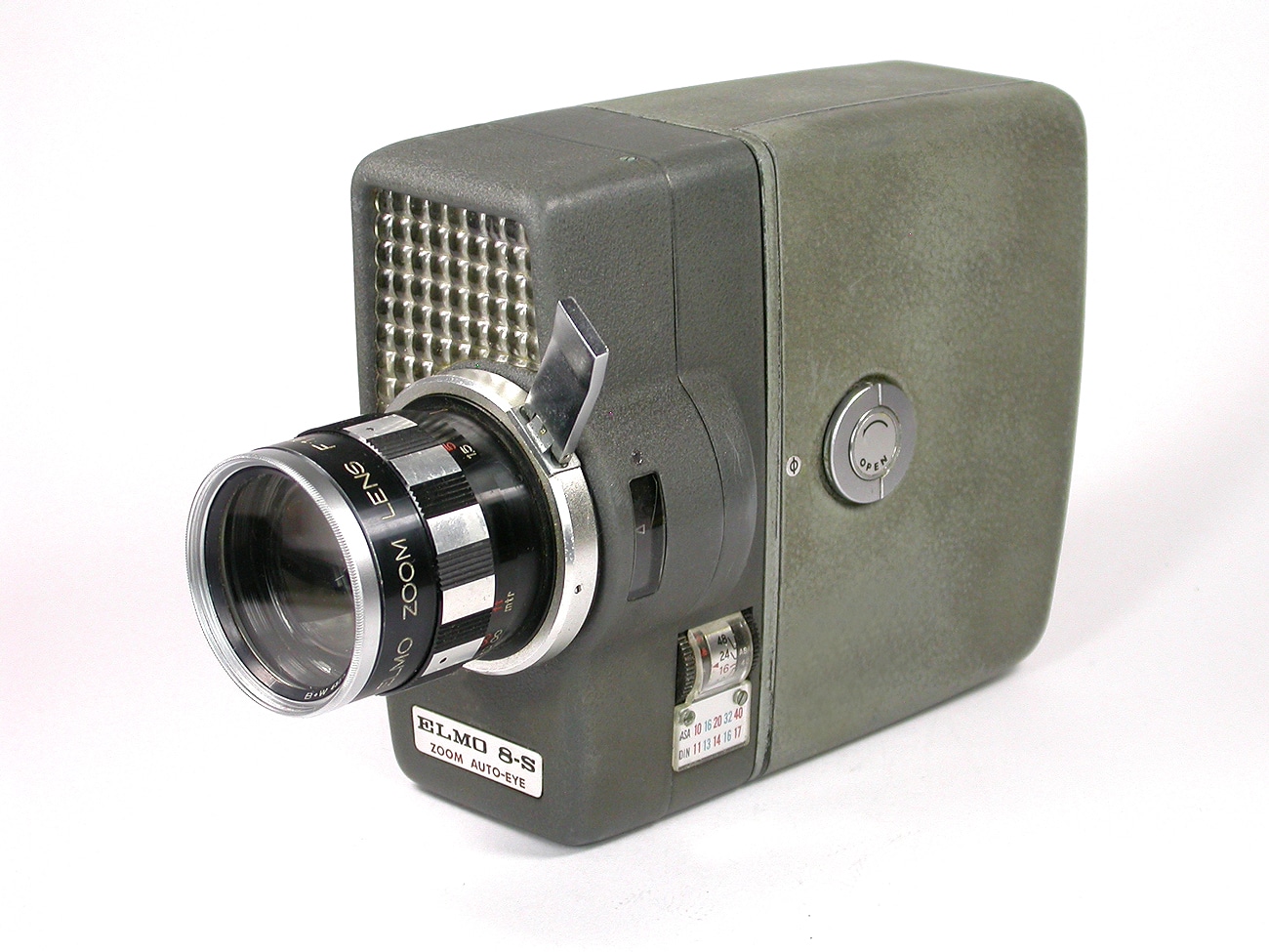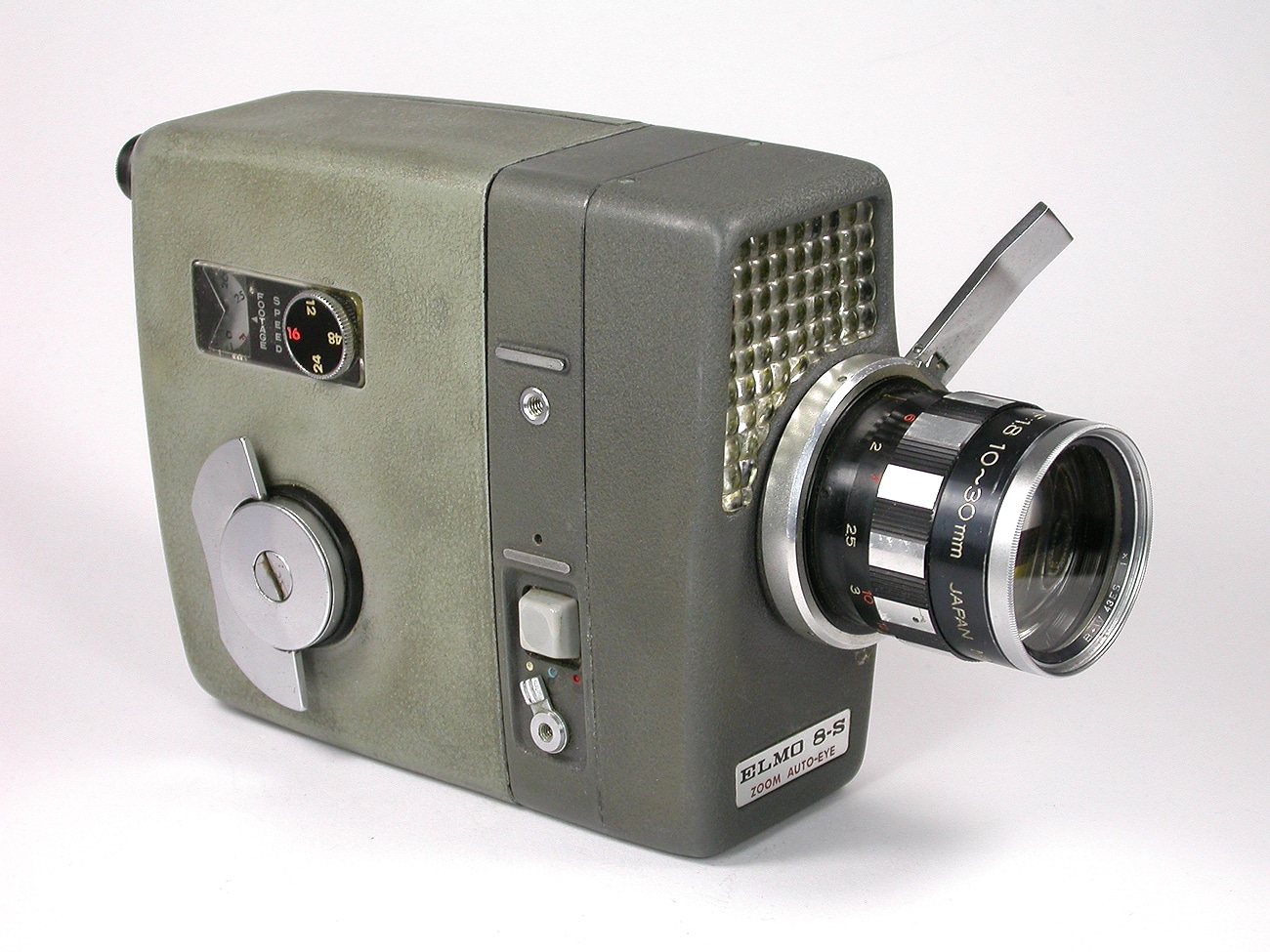 Schmalfilmkamera für Doppel-8-Spulen, hergestellt von der Elmo Co. Ltd., Nagoya, Japan, ab 1960. Objektiv: Elmo Zoom Lens 1:1,8/10-30 mm; Fokussierung und Brennweitenverstellung manuell. Reflexsucher. Federwerksantrieb (Einzelbild; 12, 16, 24 und 48 Bilder pro Sekunde); gekuppelter Belichtungsmesser (Selen-Zelle), automatische Belichtungssteuerung.