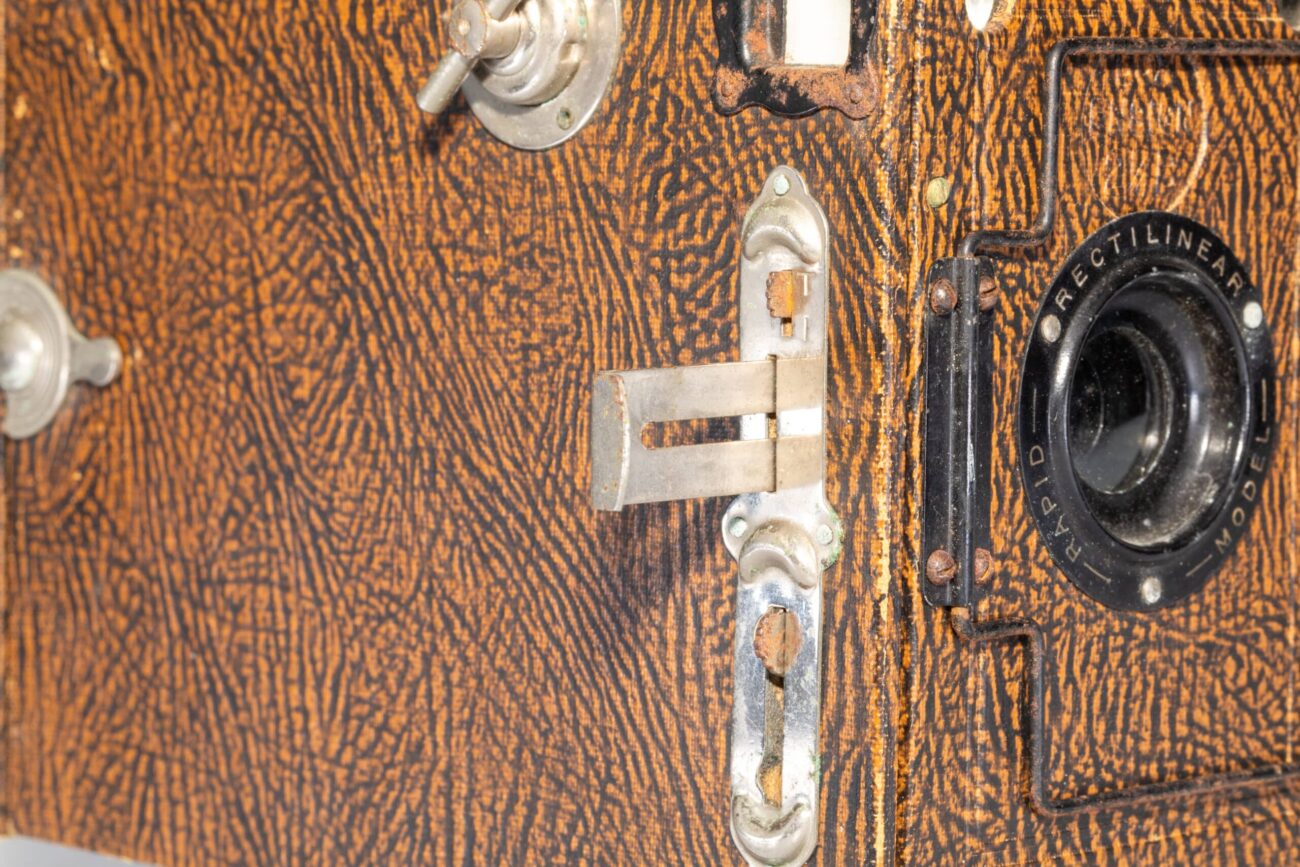 Box für den Rollfilm 2 1/4 B (Aufnahmeformat 6,5 x 11 cm), hergestellt in Großbritannien ab 1923. Objektiv: Rectilinear, Fixfokus. Zwei Spiegelsucher für Aufnahmen im Hoch- und Querformat; außerdem ein Rahmensucher (ungewöhnlich bei Boxkameras; als Diopter dient wohl der Verschluss der Rückwand). Einfachverschluss (T, I); Lochblenden. Handgriff. Auffällig: die „getigerte“ Belederung.