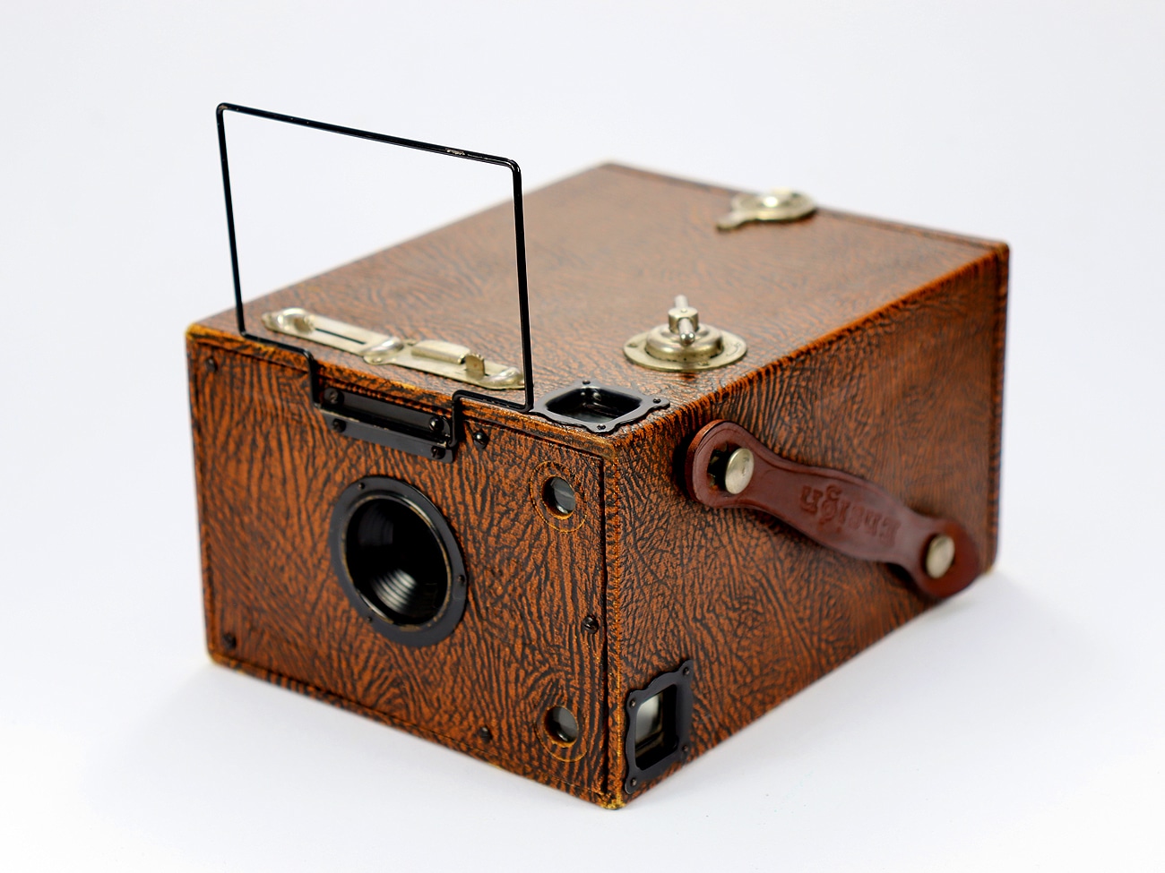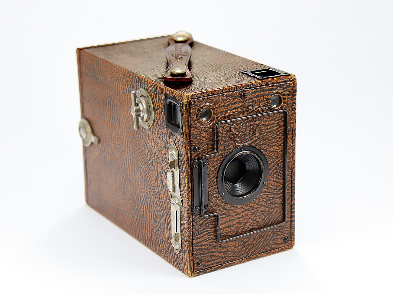 Box für den Rollfilm 2 1/4 B (Aufnahmeformat 6,5 x 11 cm), hergestellt in Großbritannien ab 1923. Einfaches Fixfokus-Objektiv. Zwei Spiegelsucher für Aufnahmen im Hoch- und Querformat; außerdem ein Rahmensucher (ungewöhnlich bei Boxkameras; als Diopter dient wohl der Verschluss der Rückwand). Einfachverschluss (T, I); Lochblenden. Handgriff. Auffällig: die „getigerte“ Belederung.