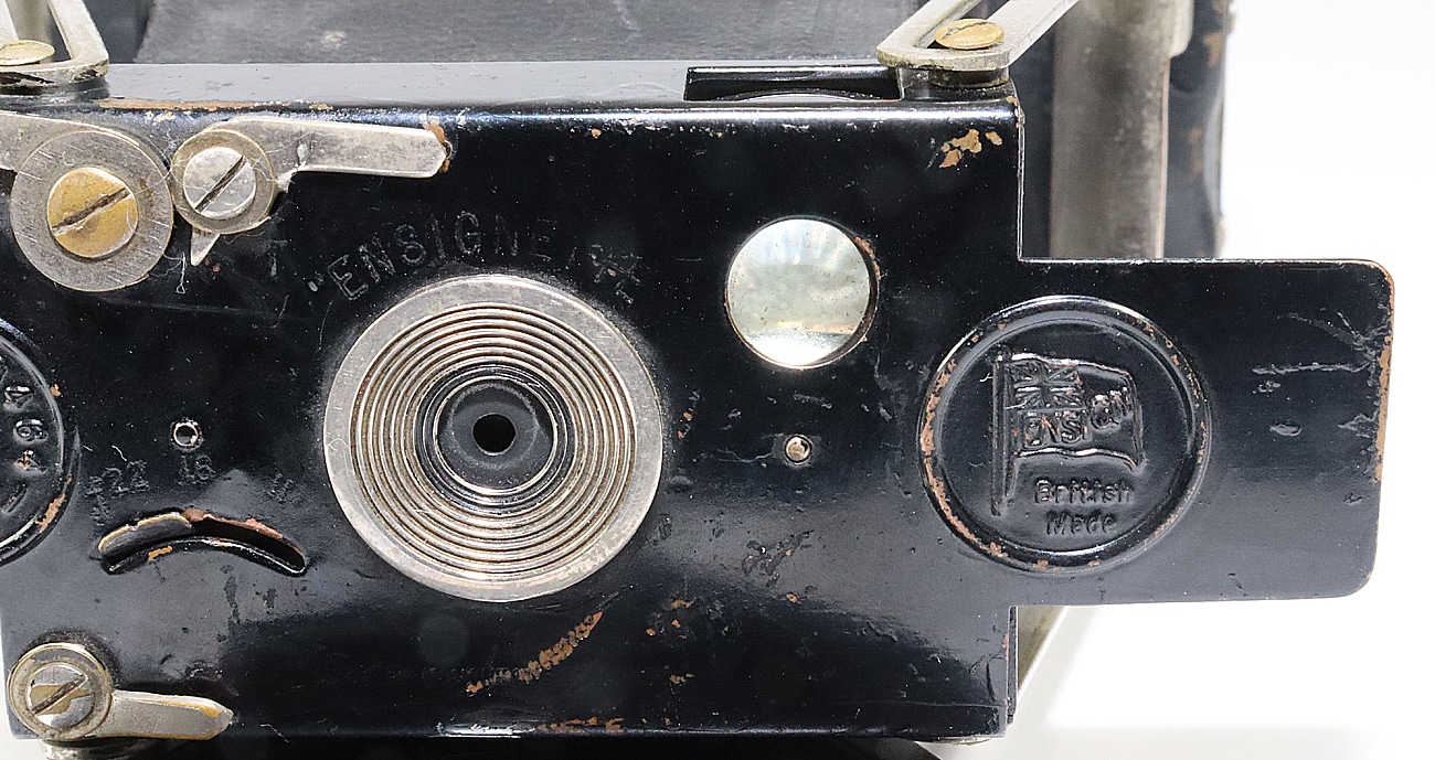 Seltsam gestaltete Sucherkamera (1909-1930) in Spreizenkonstruktion für Rollfilm Ensign E 1 (später auch Eastman Kodak 128) mit dem Aufnahmeformat 3,5 x 6 cm der britischen Marke Ensign. Hersteller: Houghton & Son, London (1867), Houghton Ltd. (1904), Houghton & Butcher (1926-1961).