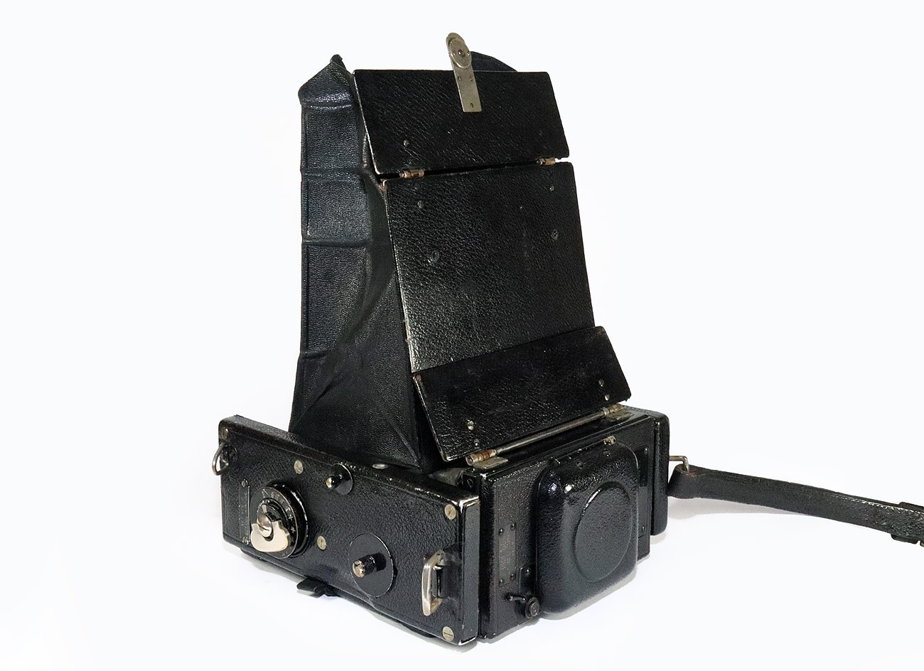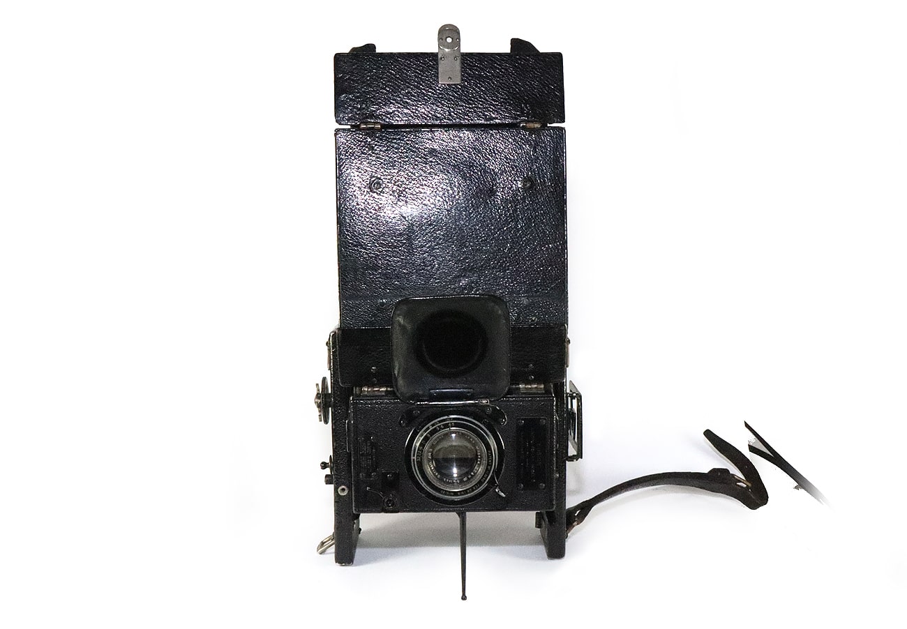 Die technische Ausstattung ist beachtlich: Tuchschlitzverschluss mit B, T und 1/10 bis 1.000 Sekunde, Format 9 x 12 cm (unser Museumsmodell). Es gab später auch eine kleinere Version für Platten mit 6 x 9 cm, ausklappbarer Lichtschachtsucher aus Leder mit Streulichtschutz. Schärfeeinstellung über Spiegel und Mattscheibe in voller Größe, oder eingeschobene Mattscheibe in der Filmebene. Das war kein Problem, denn der Spiegel klappte vor dem Auslösen nicht automatisch mit dem Aufziehen des Verschlussrollos nach unten (kein Rückschwingspiegel). Aufklappbarer Sportsucher, seitlich Zubehörschuh. Korpus aus Holz, mit Leder bezogen. Hochklappbarer Objektivschutz, Tragegurt. Das Tragegurt ist allerdings so ungünstig auf der Unterseite angebracht, dass man ihn beim Fotografieren mit aufgesetzter Kamera immer auf der einen Seite abnehmen muss.
