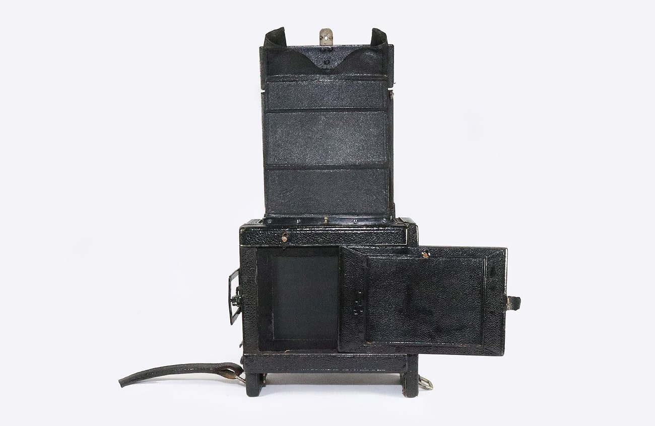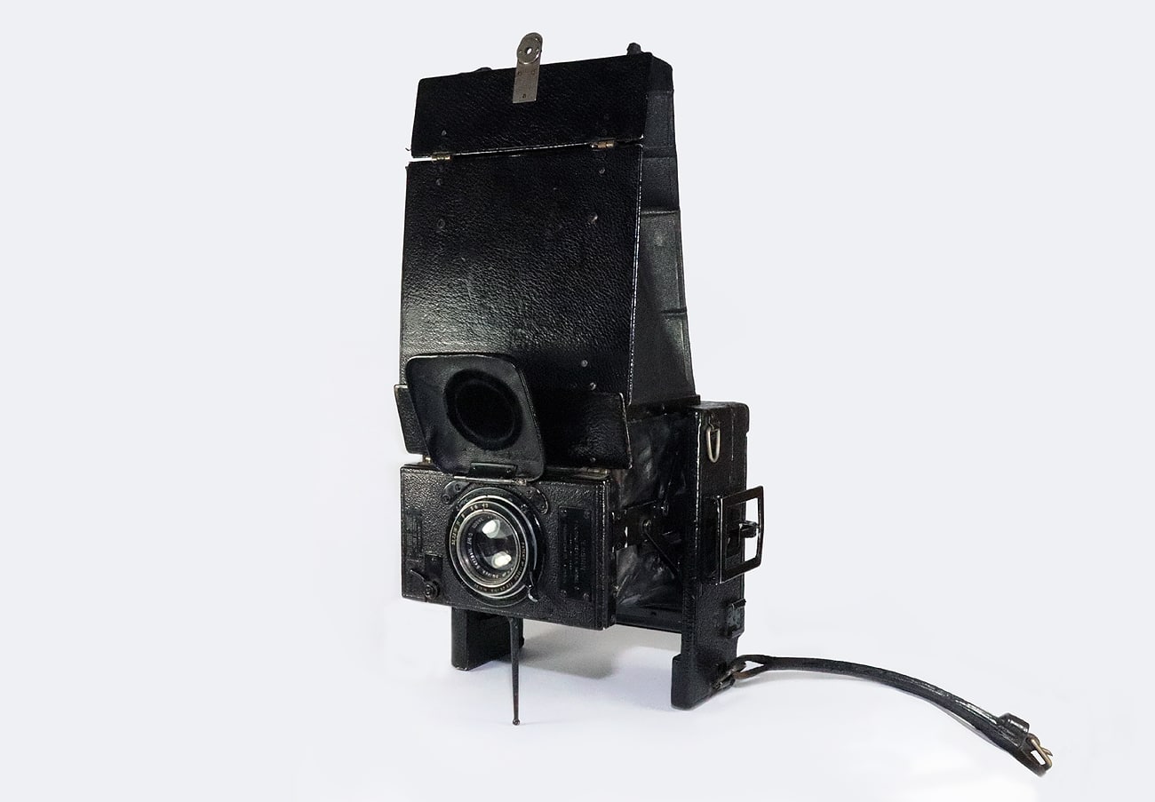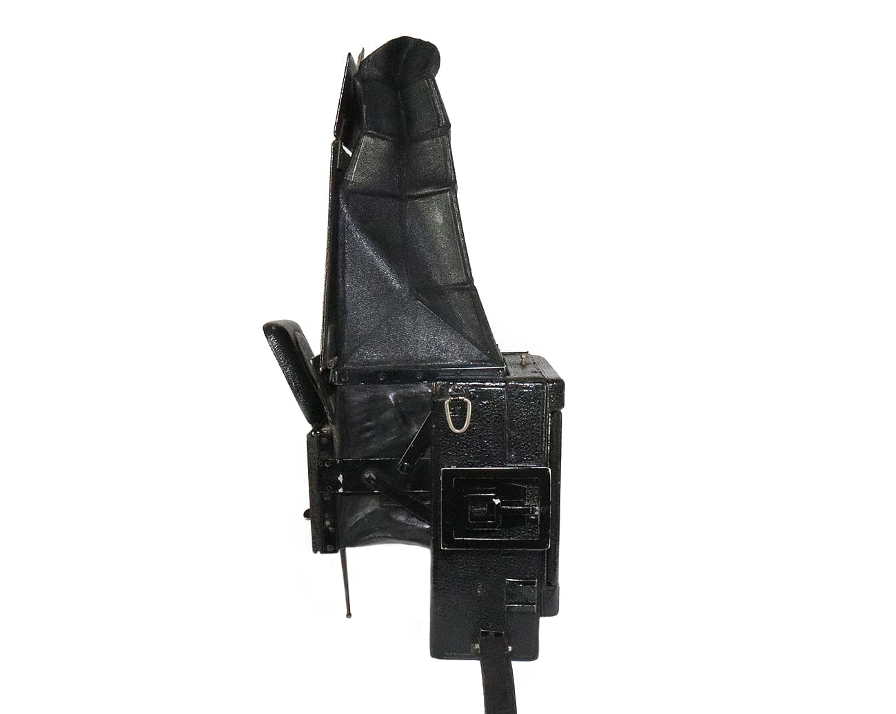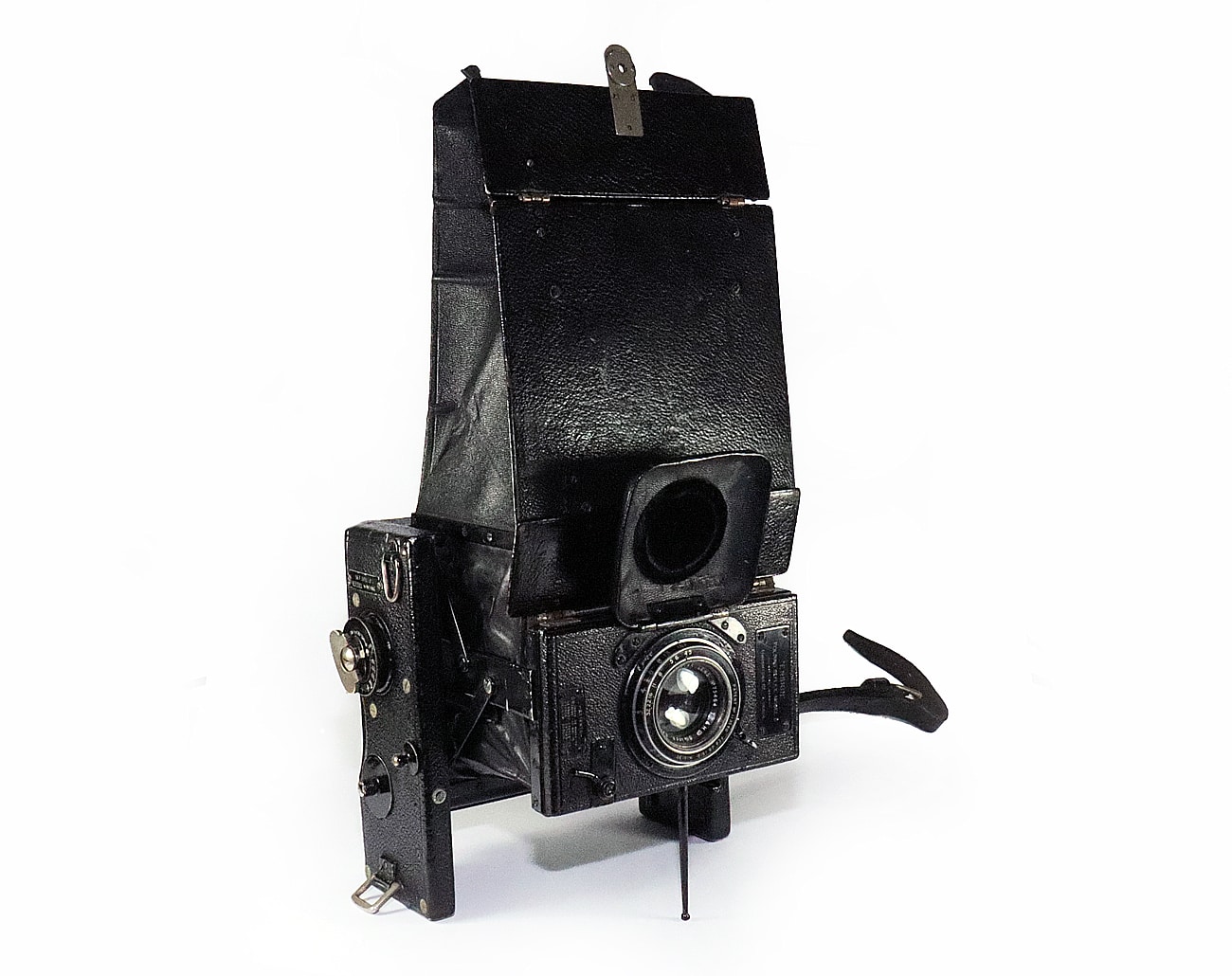 Englische antike Spiegelreflexkamera (ab etwa 1914 bis in die 1920er Jahre gebaut von Houghton, London) für Platten oder Filmpacks. Eine raffinierte Konstruktion, die das Monstrum (schussbereit gut 36 cm hoch!) auf ein handliches Format von etwa 20 x 20 x 9 cm (über alles) zusammenfalten lässt. Wenn man einmal herausgefunden hat, wo man ansetzen muss, geht das Entfalten und Falten gar nicht so schwer, um nicht zu sagen: erstaunlich leicht.