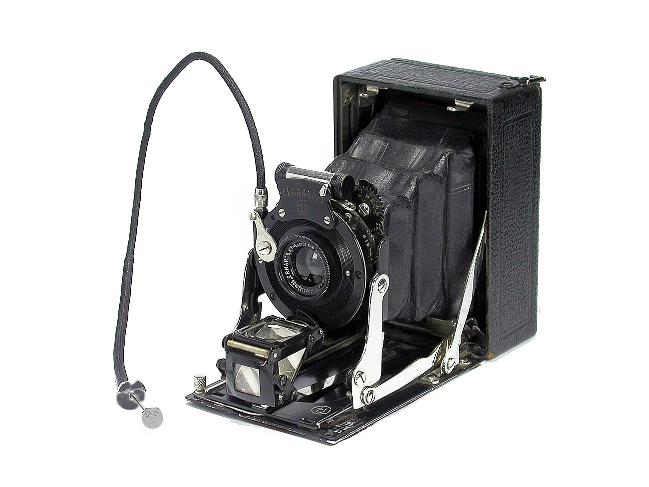 Gebaut in verschiedenen Ausführungen von 1908 bis 1925: Sucherkamera für Platten oder Filmpacks (hier im Negativformat: ca. 4,5 x 6 cm). Klapp-/Springkonstruktion, Laufbodeneinstellung, Brillantsucher, Objektiv: Ernemann Anastigmat Ernar 1:6,3/80 mm. Verschlusszeiten: 1 bis 1/100 Sekunde.