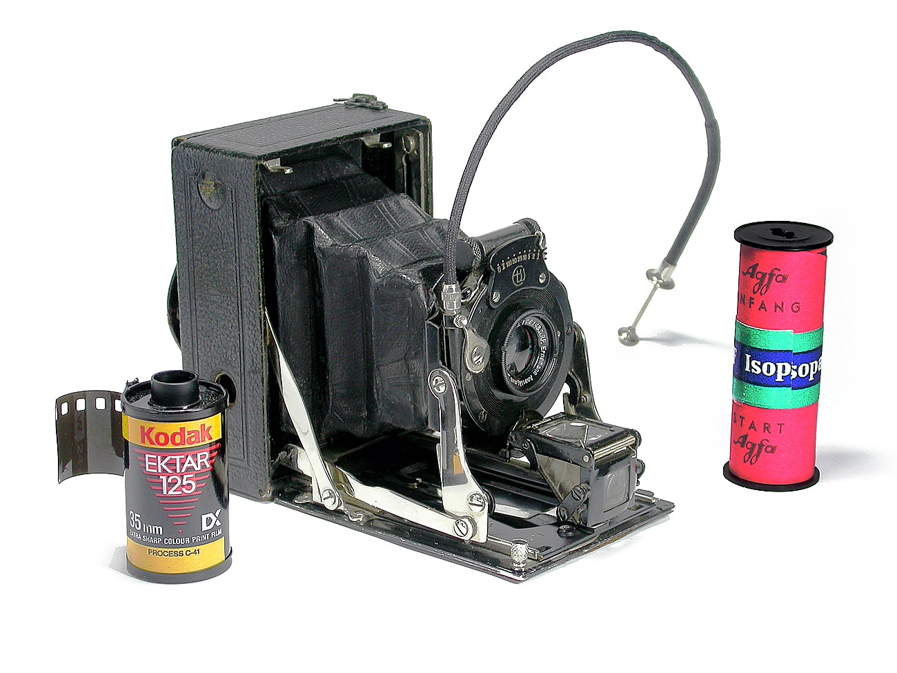 Überraschend klein: Plattenkamera aus gutem Hause, nämlich von Ernemann-Kameras, Heinrich Ernemann Werke AG, Dresden, laut Seriennummer hergestellt im Jahre 1921. Hier zum Größenvergleich fotografiert mit einem Kleinbildfilm und einem Rollfilm.