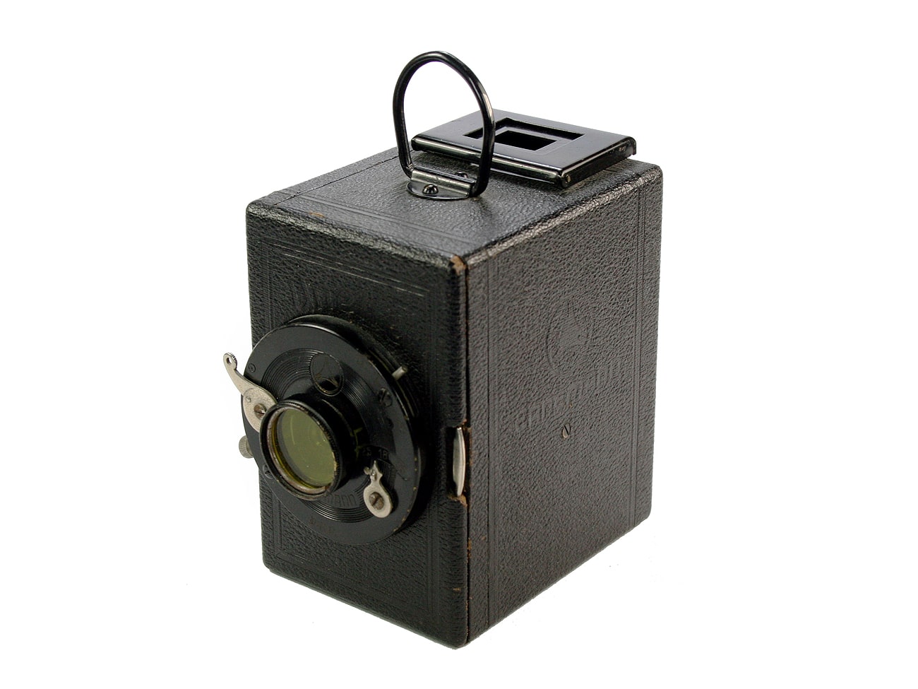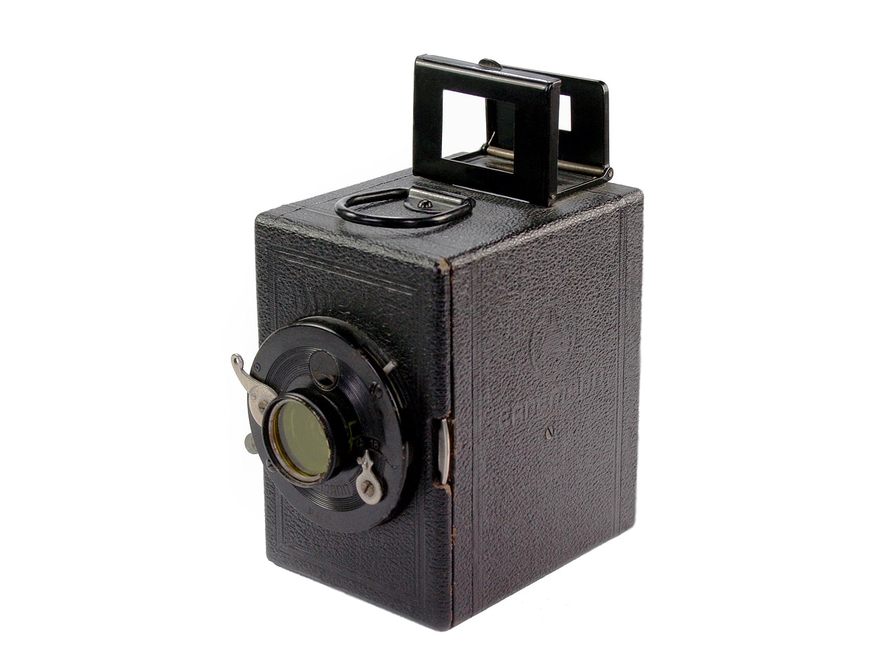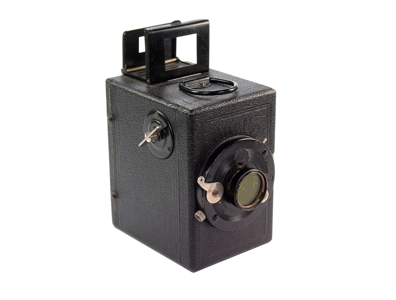 Wunderschöne, neuwertige Boxkamera von Ernemann (Heinrich Ernemann Werke AG, Dresden) für den speziellen Ernemann-Rollfilm mit 24 Aufnahmen (Aufnahmeformat 22 x 33 mm), hergestellt ab 1926. Der verwendete Rollfilm war ein unperforierter Kinofilm (und damit eigentlich der Kleinbildfilm 135) mit Papierrückseite; ein aufwändiges Bildzählwerk war deshalb nicht nötig. Objektiv 1:12,5/40 mm; Blenden: 12,5, 18 und 25; auf den Abbildungen hier jeweils mit aufgestecktem Grünfilter. Aufklappbarer Rahmensucher. Einfachverschluss, manuelle Belichtungssteuerung. Mit Kunstleder bezogenes Holzgehäuse (etwa 9 x 9 x 6 cm).