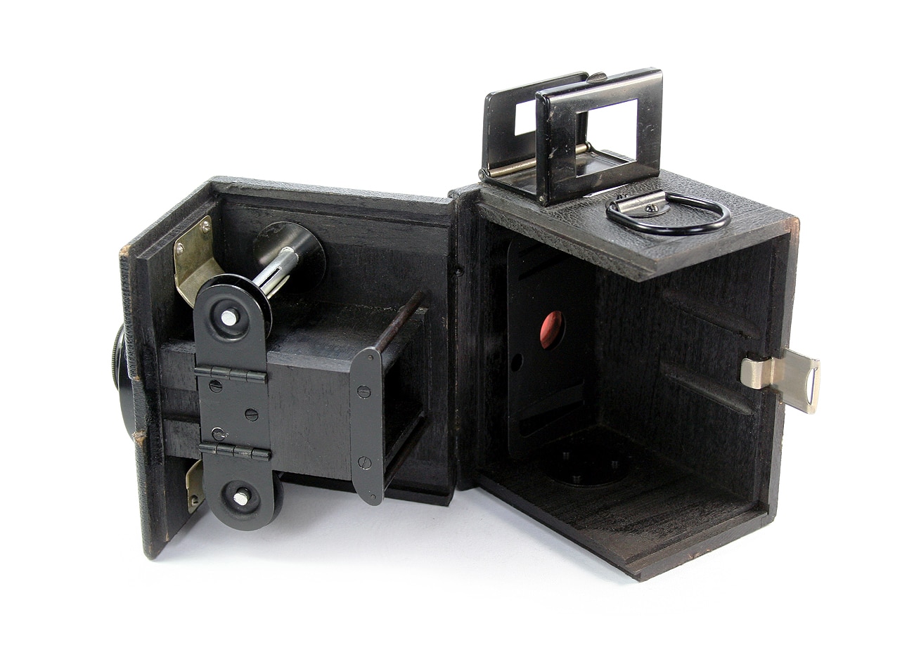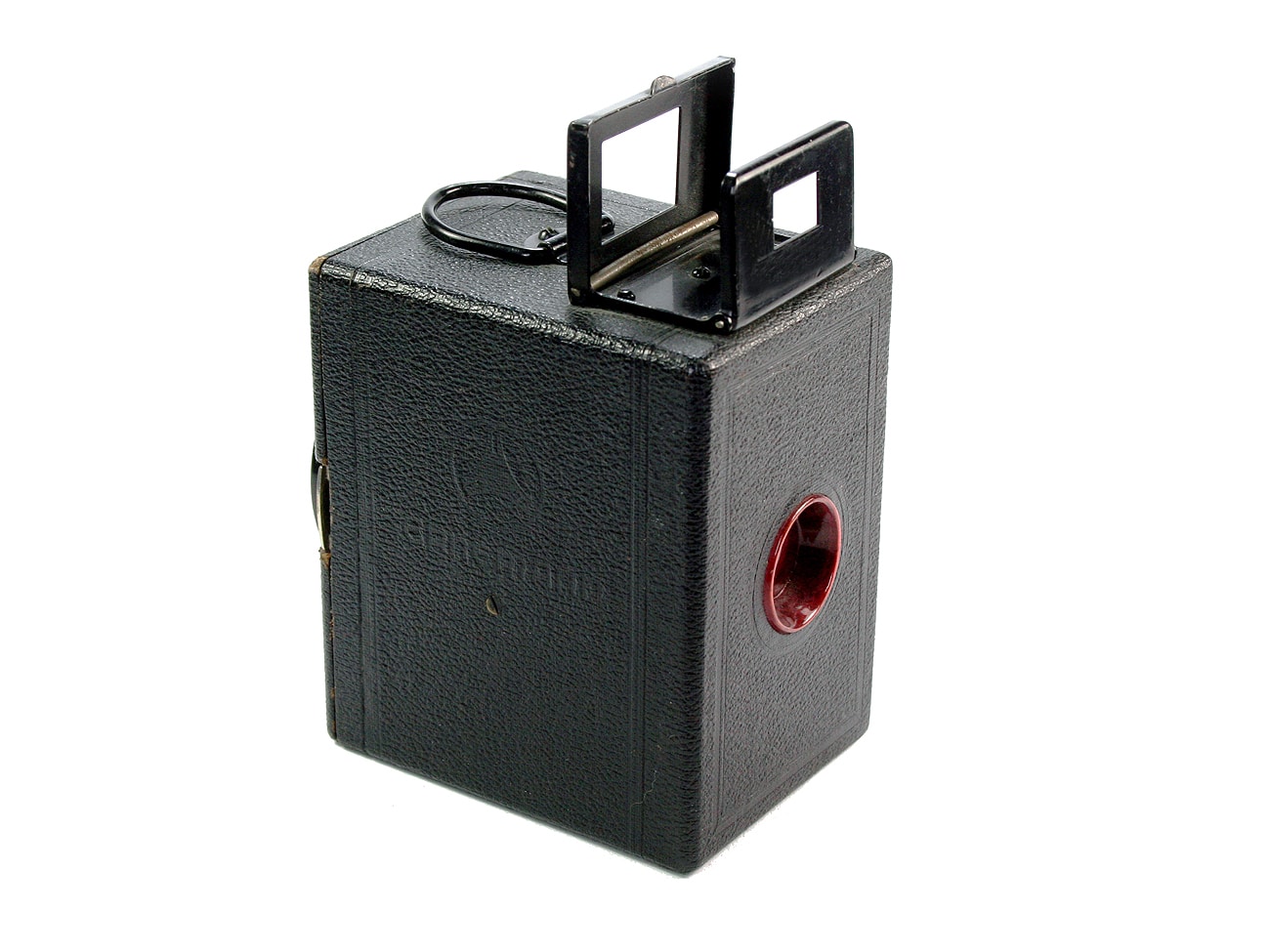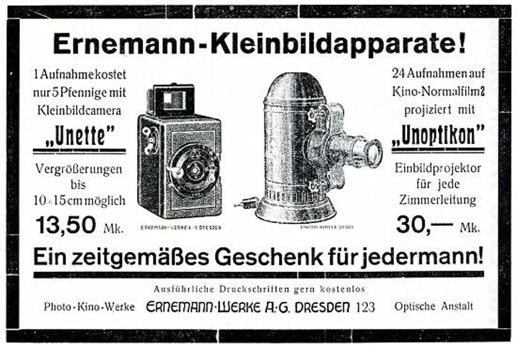 Wunderschöne, neuwertige Boxkamera von Ernemann (Heinrich Ernemann Werke AG, Dresden) für den speziellen Ernemann-Rollfilm mit 24 Aufnahmen (Aufnahmeformat 22 x 33 mm), hergestellt ab 1926. Der verwendete Rollfilm war ein unperforierter Kinofilm (und damit eigentlich der Kleinbildfilm 135) mit Papierrückseite; ein aufwändiges Bildzählwerk war deshalb nicht nötig. Objektiv 1:12,5/40 mm; Blenden: 12,5, 18 und 25; auf den Abbildungen hier jeweils mit aufgestecktem Grünfilter. Aufklappbarer Rahmensucher. Einfachverschluss, manuelle Belichtungssteuerung. Mit Kunstleder bezogenes Holzgehäuse (etwa 9 x 9 x 6 cm).
