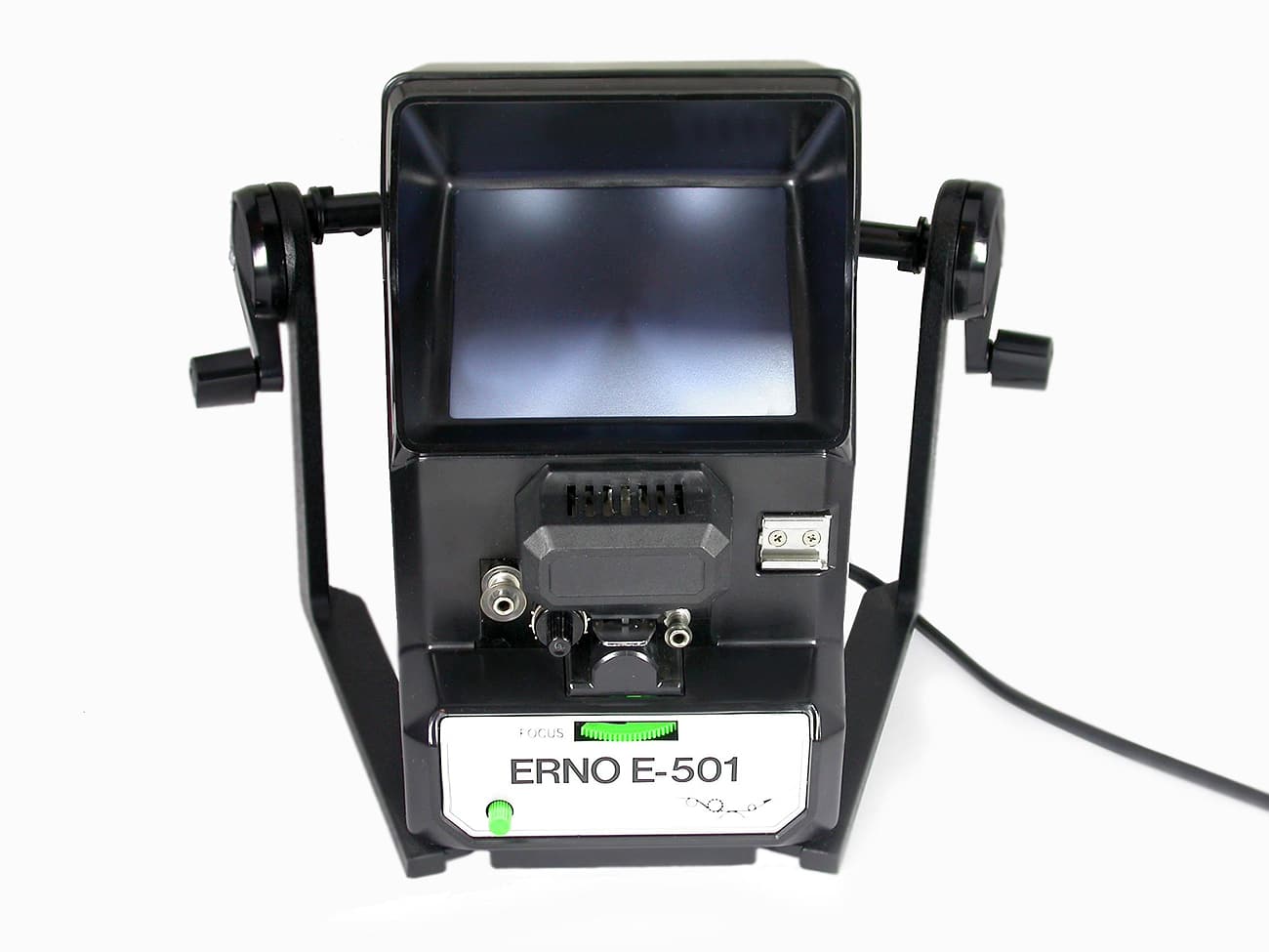 Super-8-Film-Editor, 1970er Jahre, vermutlich aus Japan. Manueller Filmtransport, Beleuchtung mit Netzbetrieb, einklappbare Spulenarme.