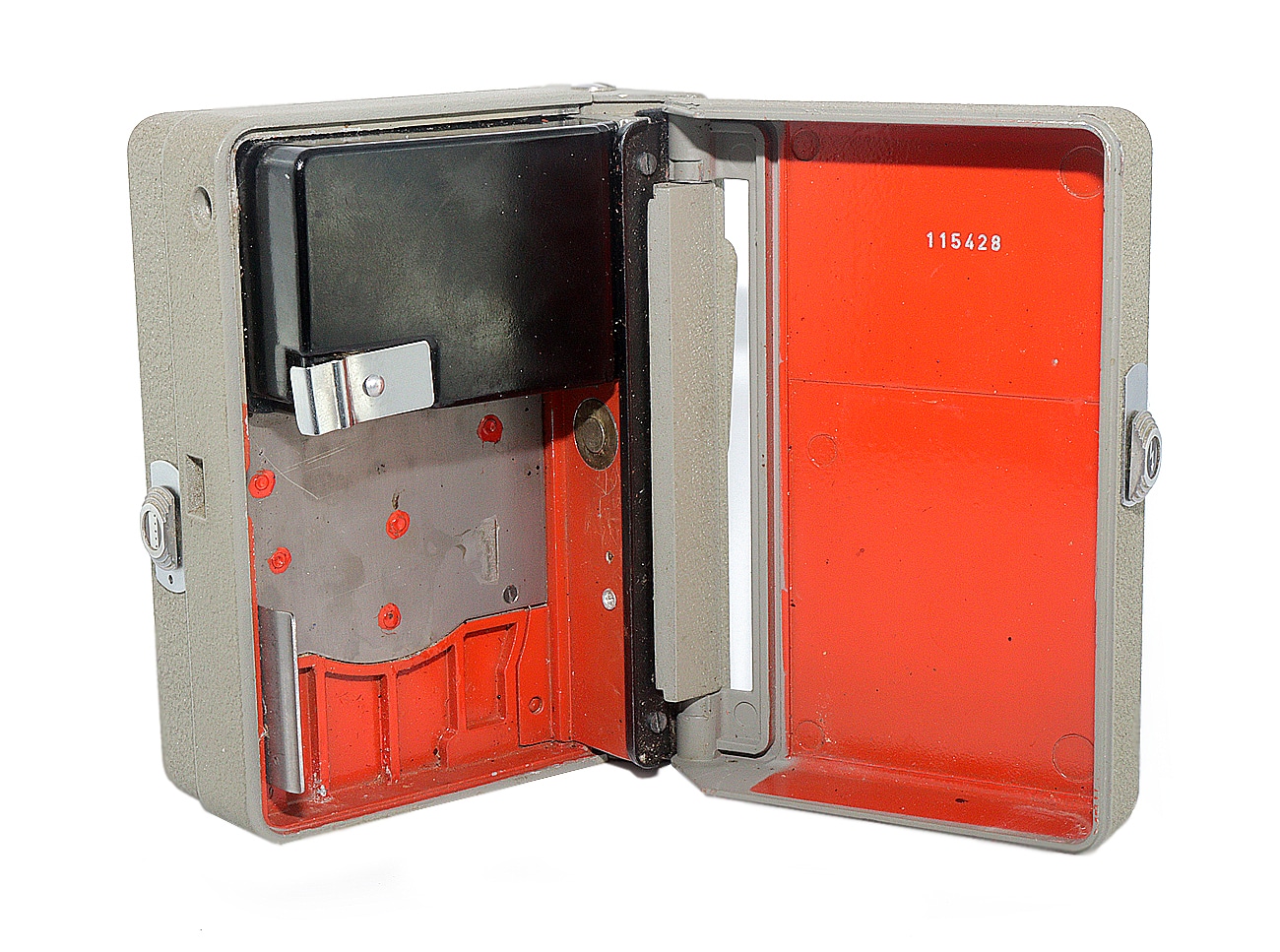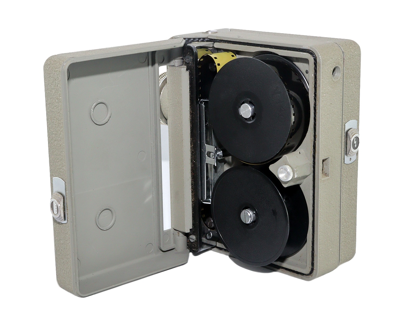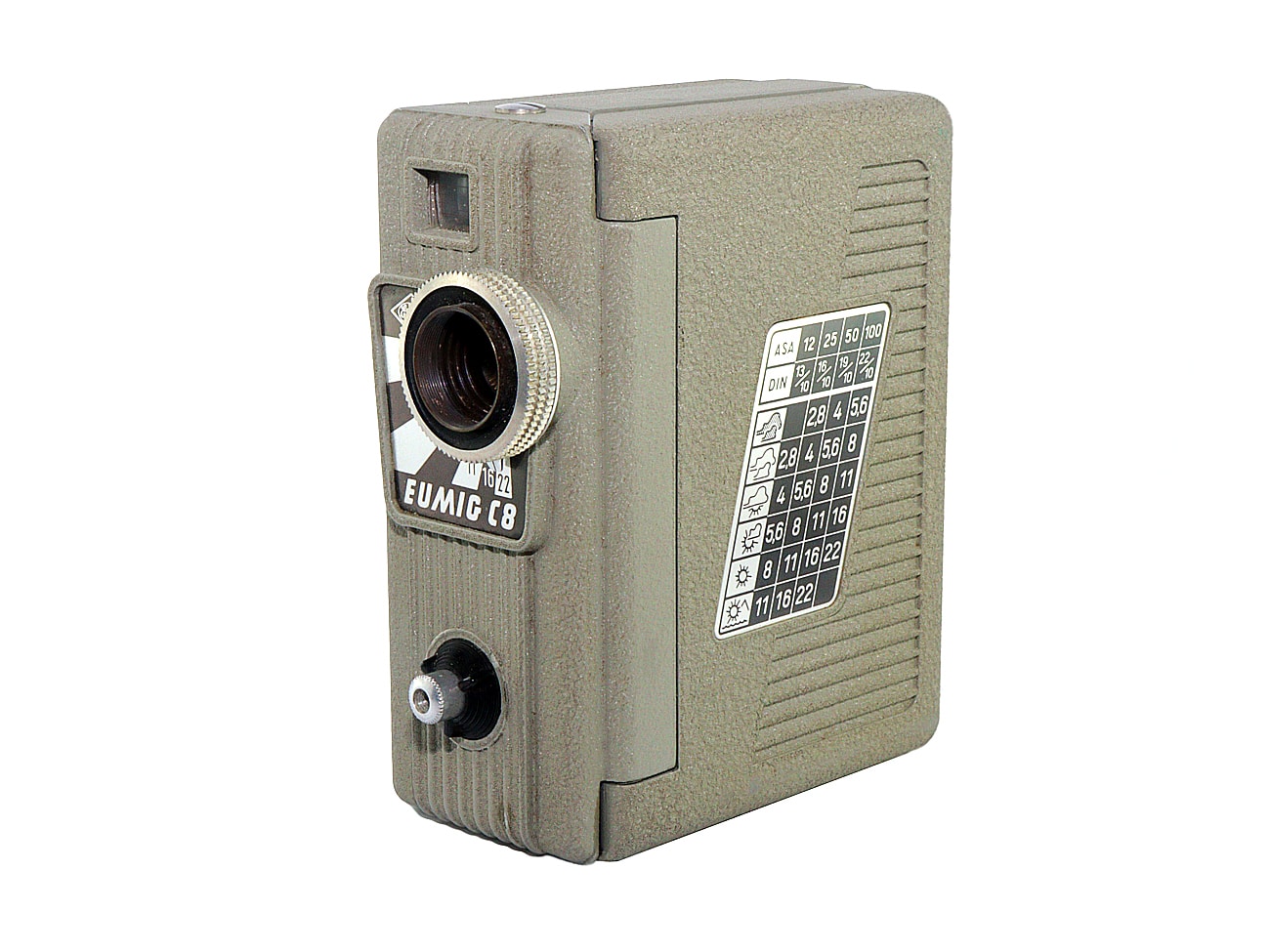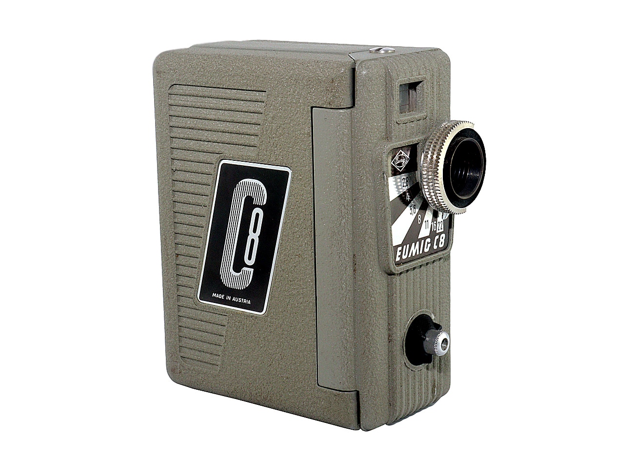 Relativ seltene Doppel-8-Filmkamera von Eumig (Wien), gebaut von 1954 bis 1956 in etwa 8.000 Stück. Elektromotorischer Filmtransport mit 16 Bilder pro Sekunde (Stromversorgung: 1 x 4,5-Volt-Flachbatterie). Mit verschiedenen Objektiven lieferbar. Hier mit Eumig-Wien Eugon V 1:2,8/12,5 mm (Seriennummer: 16863), abblendbar bis 22, Fixfokus. Schweres Metallgehäuse, Stativgewinde.