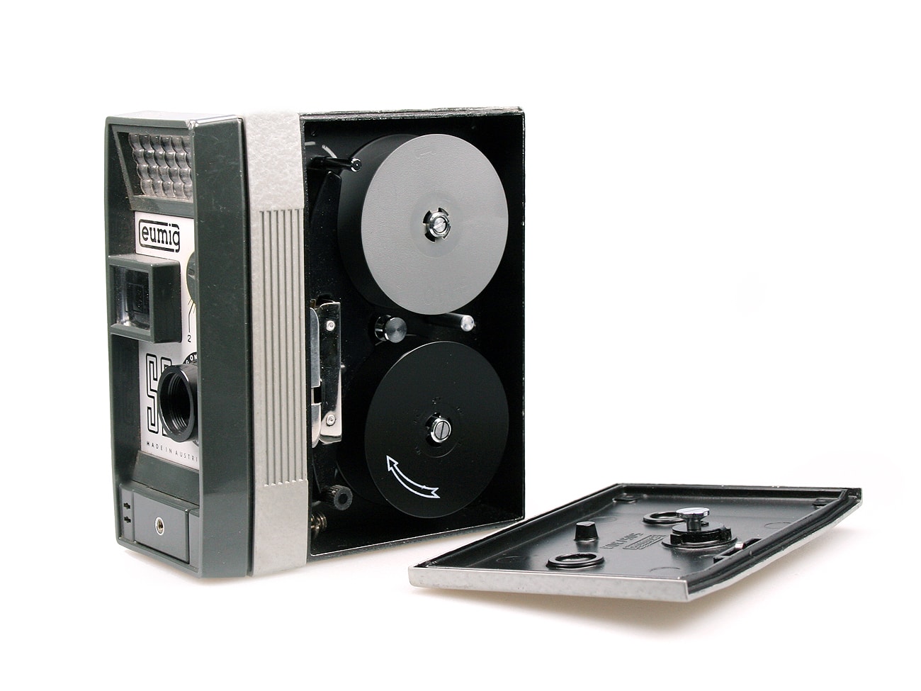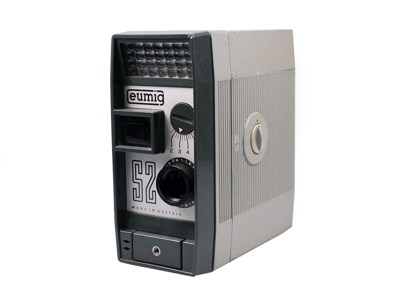 Schmalfilmkamera für Doppel-8-Spulen, hergestellt in Österreich ab 1962. Objektiv: Eumigon 1:1,8/12,5 mm; Fixfokus. Fernrohrsucher mit Rahmen, der das Bildfeld bei Verwendung eines Telekonverters (zweifach) markiert. Elektrischer Filmtransport (16 Bilder pro Sekunde); Selen-Zelle zur Belichtungsmessung (Messfenster oberhalb des Objektivs), automatische Belichtungssteuerung. Der Drehschalter oberhalb des Objektivs dient zur Einstellung der Filmempfindlichkeit. Drahtauslöser- und Stativanschluss; optionaler Handgriff (nicht abgebildet).