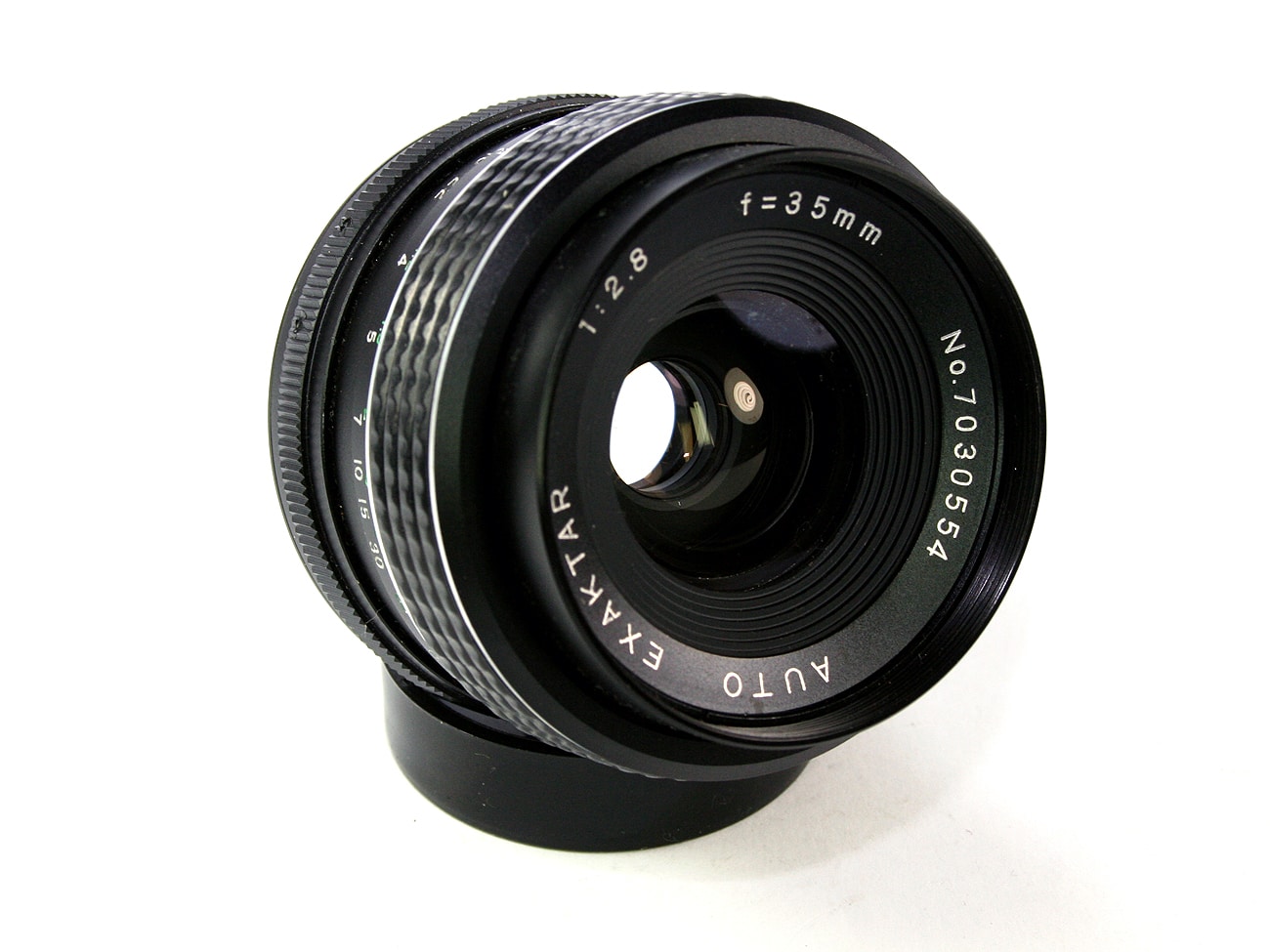 Auto Exaktar 1:2,8/35 mm, ein leichtes Weitwinkelobjektiv mit 35 mm Brennweite, hergestellt in Korea für Exakta (West). Der Kameraanschluss ist ein M-42-Schraubgewinde. Die kürzeste Entfernungseinstellung beträgt 70 Zentimeter, es wiegt etwa 200 Gramm.