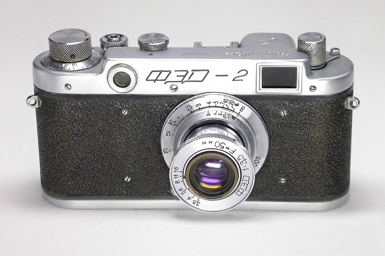 „Russische Leica“ von FED (F. E. Dserschinski-Maschinenwerke, Charkov, UdSSR), Baujahre 1955 und 1956, Kleinbildformat 24 x 36 mm auf Film 135. Versenkbares Objektiv FED 1:3,5/50 mm mit M-39-Leica-Schraubgewinde, Schnittbildentfernungsmesser, Zeiten: B und 1/25 bis 1/500 Sekunde. Mechanischer Schlitzverschluss, manuelle Belichtungssteuerung.