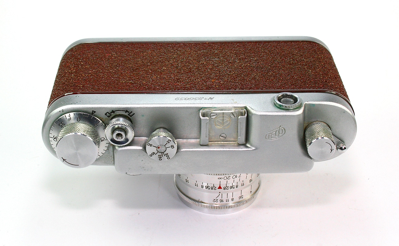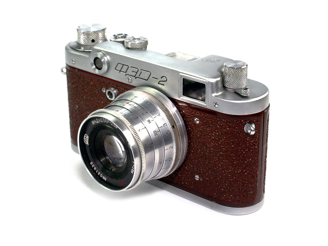 „Russische Leica“ von FED (F. E. Dserschinski-Maschinenwerke, Charkov, UdSSR), Baujahre 1956 und 1957, Kleinbildformat 24 x 36 mm auf Film 135. Versenkbares Objektiv FED 1:2,8/50 mm mit M-39-Leica-Schraubgewinde, Schnittbildentfernungsmesser, Zeiten: B und 1/25 bis 1/500 Sekunde. Mechanischer Schlitzverschluss, manuelle Belichtungssteuerung.