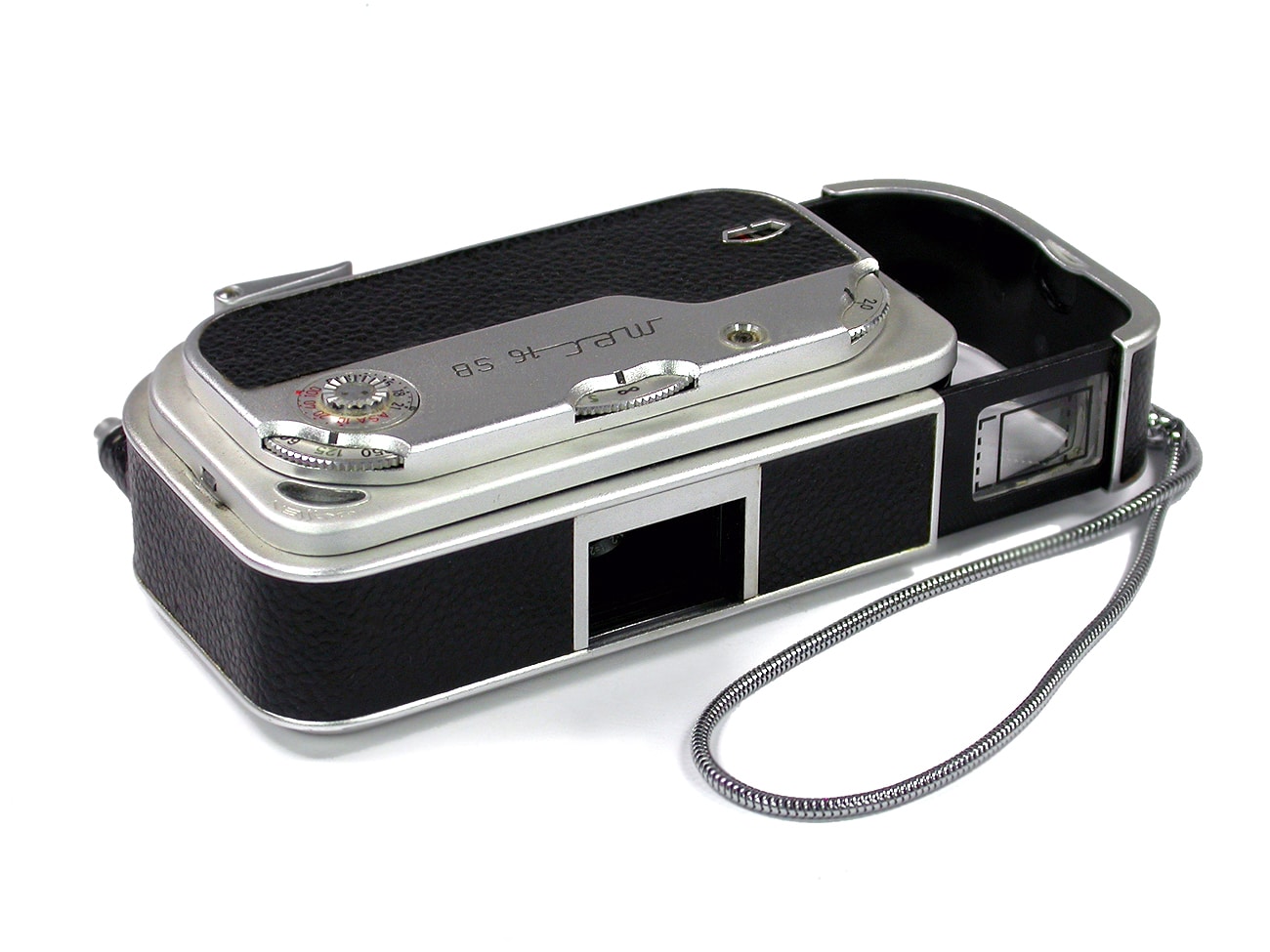 Sucherkamera (1960) für den 16-mm-Film (Tageslichtkassette mit 24 Bildern im Format 10 x 14 mm). Die eigenwillig konstruierte Kleinstbildkamera MEC 16 SB der Firma Feinwerktechnik GmbH, Lahr. Manuelle Schärfeeinstellung, mechanischer Schlitzverschluss, Integralmessung, manuelle Belichtungssteuerung. Objektiv: hier ein Rodenstock Heligon 1:2,0/22 mm.