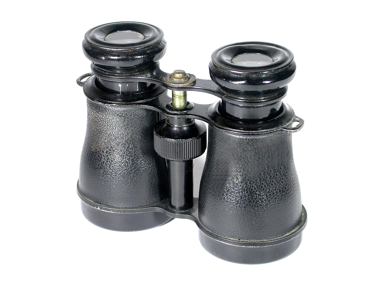 Einfaches älteres Fernglas, unbezeichnet, keine Daten. Feste Brücke, Mitteltrieb mit Kunststoffrändelrad.