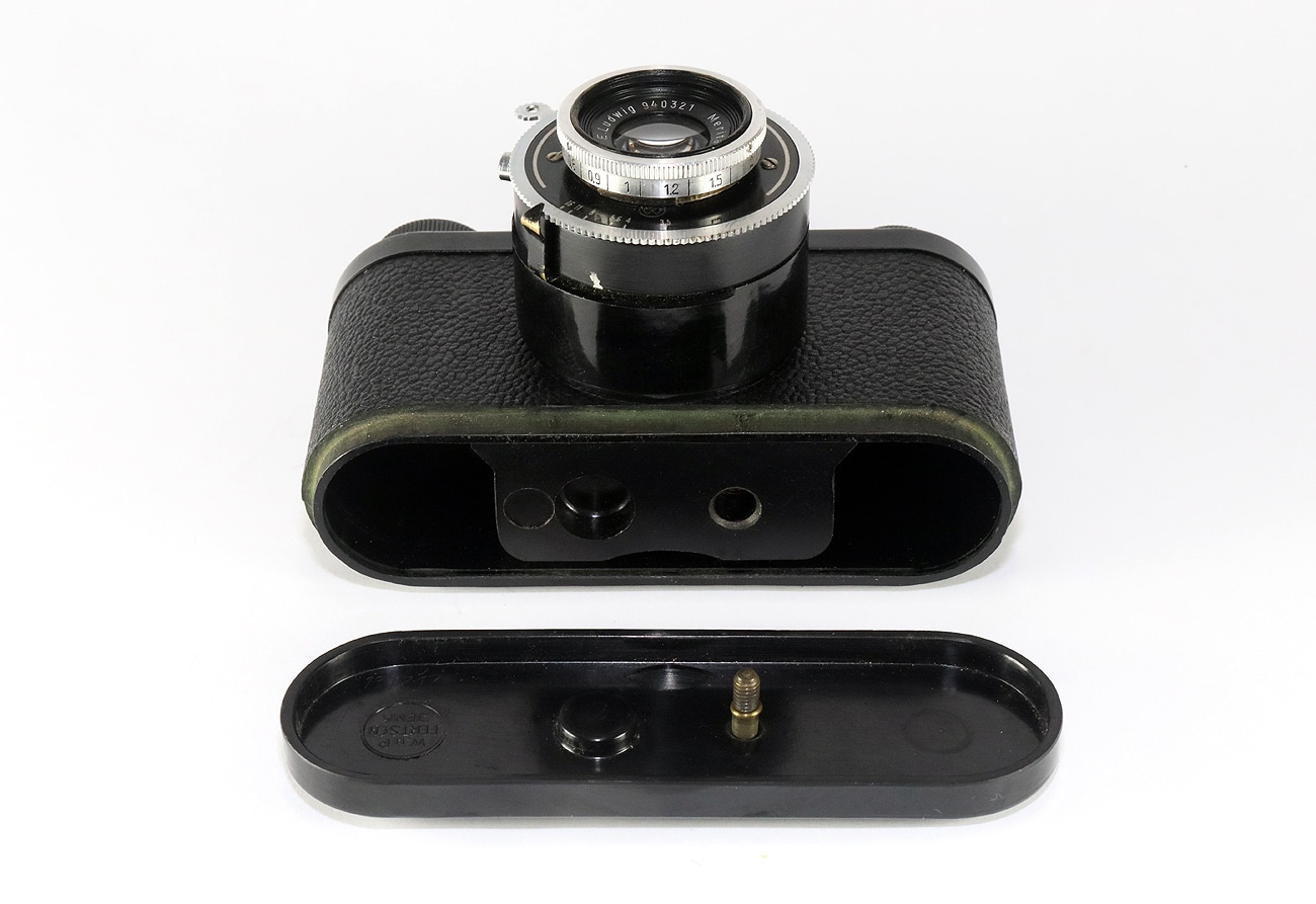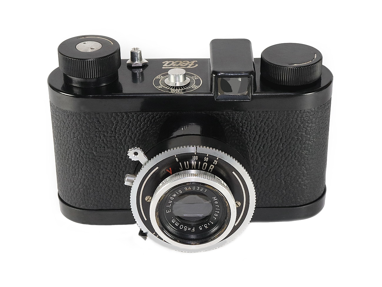 Eine kleine, etwas an die Schraub-Leica erinnernde Sucherkamera (1955) für den Kleinbildfilm 135, Aufnahmeformat 24 x 36 mm. Hersteller: W. & P. Fertsch, Jena, Maxim-Gorki-Straße 95 (DDR). Optischer Fernrohrsucher, Filmzählwerk, manuelle Schärfeeinstellung, schwarzes Bakelitgehäuse, mechanischer Zentralverschluss Junior der Größe 00, manuelle Belichtungssteuerung mit B, 1/25, 1/50 und 1/100 Sekunde. Objektiv (unvergütet): E. Ludwig Meritar 1:3,5/50 mm, hier mit der Seriennummer 940321. Kürzeste Einstellentfernung: 60 Zentimeter, bis 16 abblendbar. Drahtauslöseranschluss, kein Blitzkontakt.