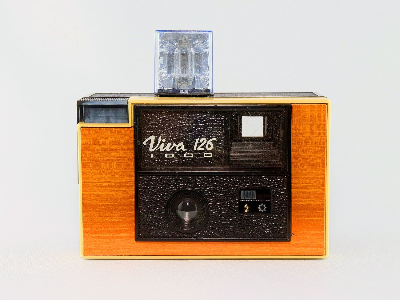 Einfache Sucherkamera aus Frankreich für den Kassettenfilm 126 (Negativformat: 28 x 28 mm), gebaut ab 1972. Die Viva 126 mit dem Zusatz 1000 gleicht der Viva 126 bis auf die zusätzliche Siebdruckbeschriftung „1000“ (im Bild). Von diesem Modell gibt es wiederum zwei Varianten, die sich durch die Position des Aufdrucks „1000“ unterscheiden: Einmal befindet sich der Schriftzug wie bei diesem Museumsexemplar in einem Fenster oberhalb des Objektivs.