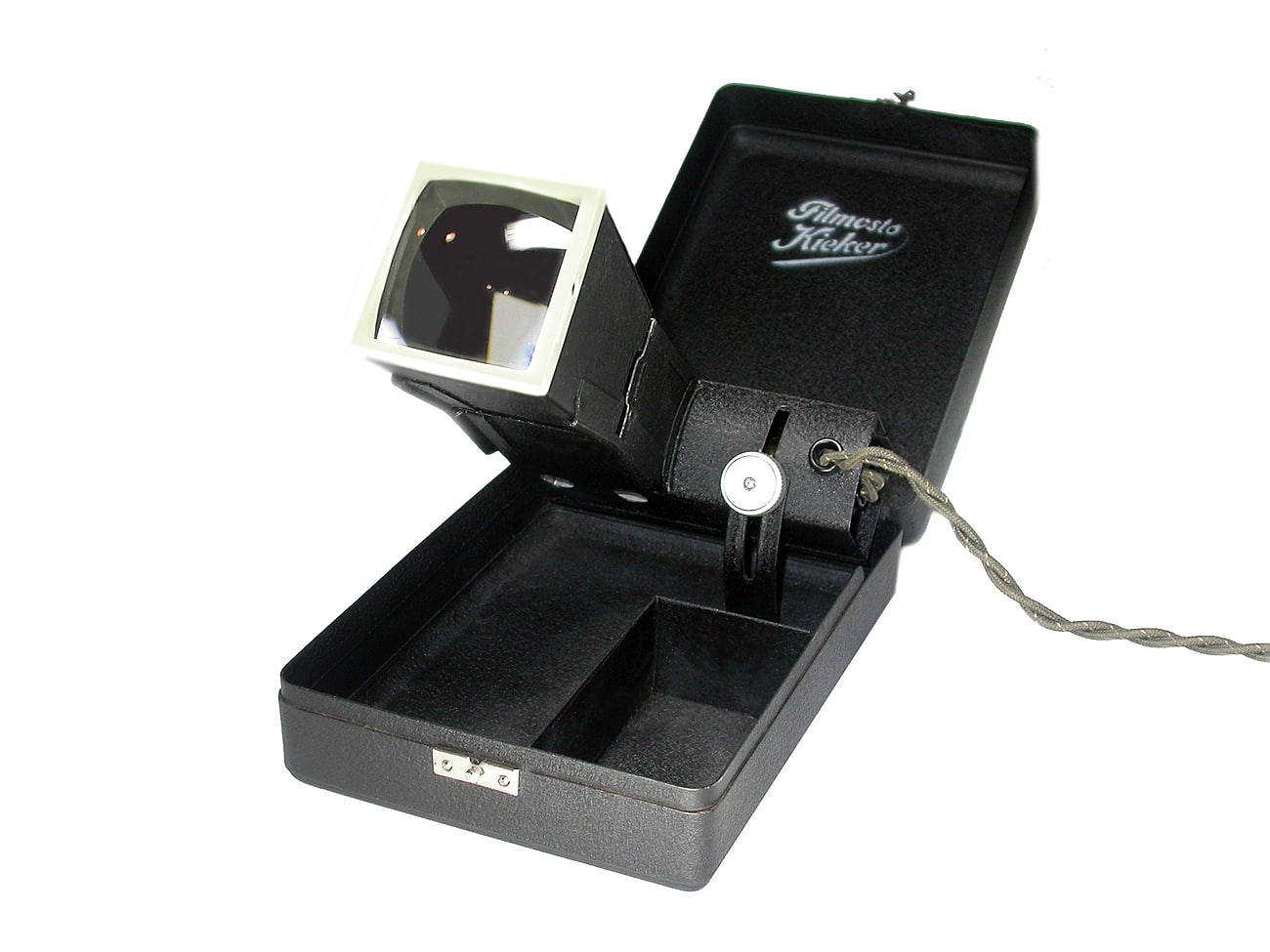 Handliches, zusammenlegbares Betrachtungsgerät für 5 x 5-cm-Kleinbilddias und Filmstreifen, „auch zur Negativbetrachtung ganzer Kleinbildfilme hervorragend geeignet“ (Bremaphot-Katalog 1954/1955). Das 1939 erstmals vorgestellte Gerät wurde kontinuierlich weiterentwickelt, später auch in einer Version für 7 x 7 cm-Mittelformatdias. Für die Diabetrachtung wird ein vertikaler 3-fach-Schieber eingesetzt, nach Entnahme des unteren Dias rutscht von oben das nächste in Position. Die Blechschatulle mit Hammerschlageffekt bietet zusätzlich Raum für 25 Diapositive „und kann bequem in einer Aktentasche untergebracht werden“. Lampe: 25 Watt.