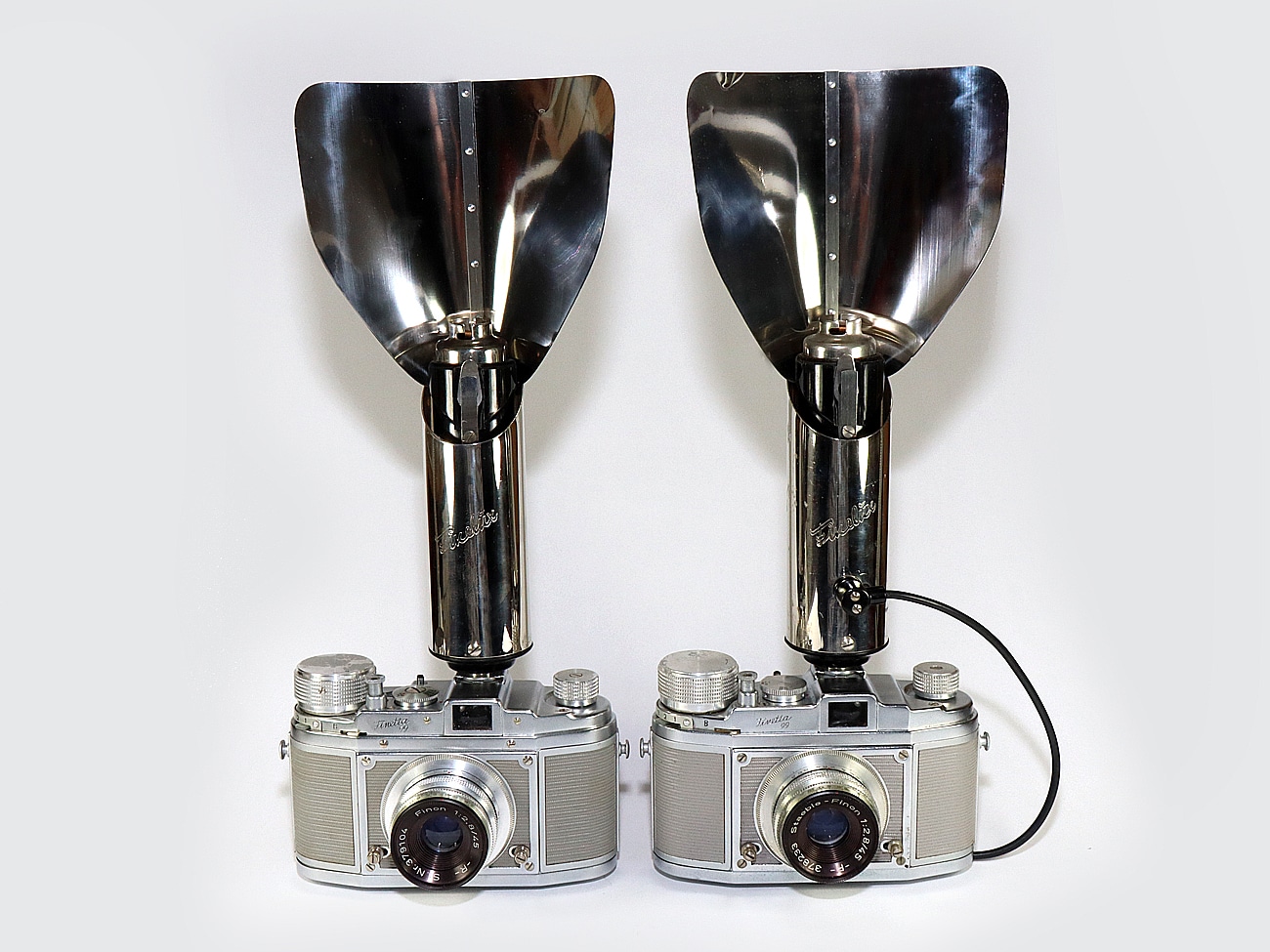Sehr selten sind die Modelle mit rückseitig eingravierten Blendenwert-Skalen oder sonstigen Gravuren außer dem Namen selbst. Dank des verhältnismäßig großen, nach oben sich weitenden Reflektors ist eine relativ weiche Ausleuchtung des Objekts und eine gute Raumausleuchtung gegeben.