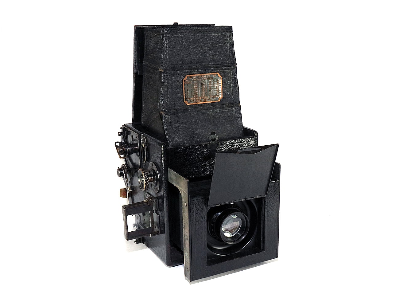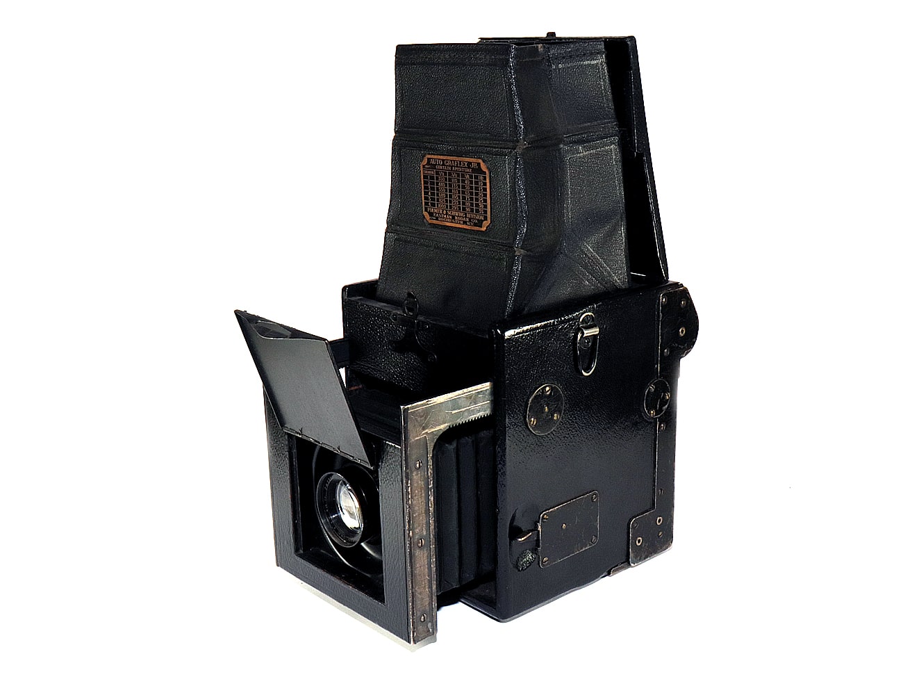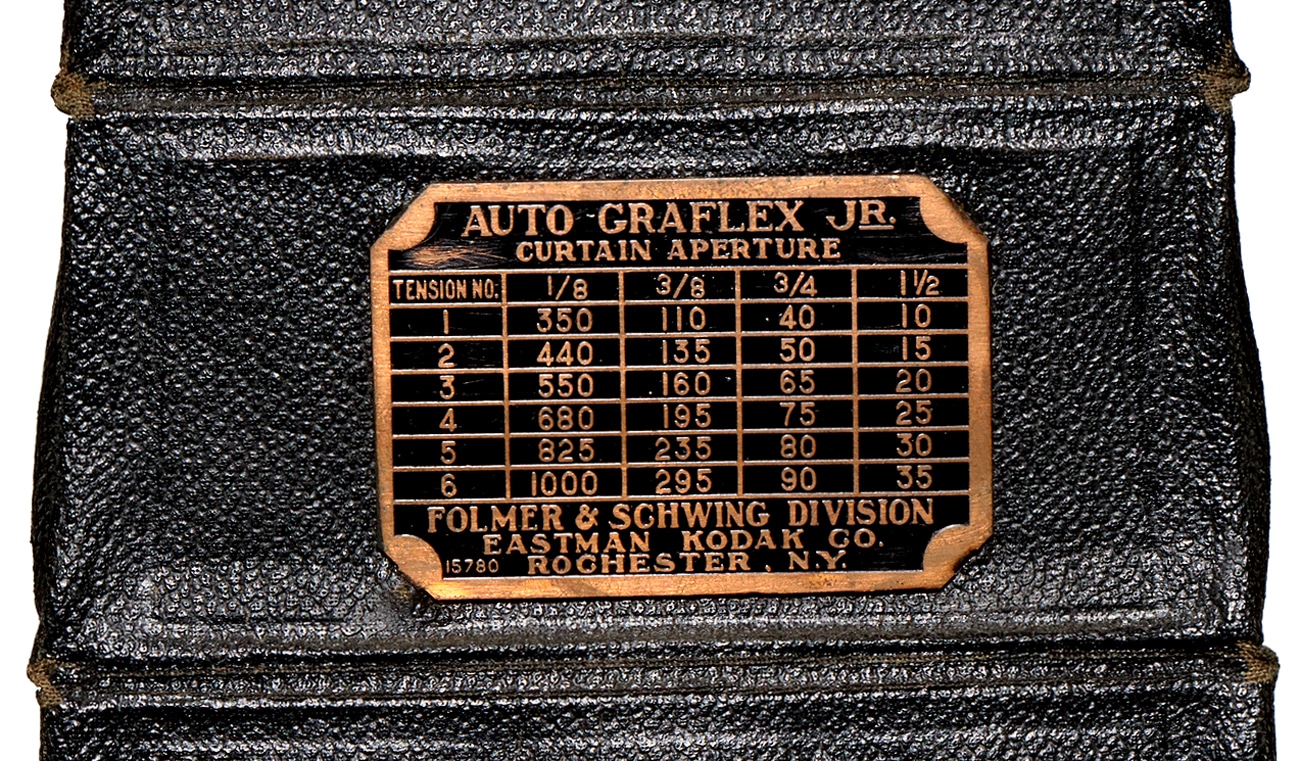 Die hier präsentierte etwas einfachere „AUTO GRAFLEX JR“ (Junior), hergestellt von 1914 bis 1924, war die einzige 2 1/4 x 3 1/4-Inch-Auto-Graflex. Sie ist leicht von späteren Series-B-Graflex-Kameras zu unterscheiden, da sich bei der Junior der Fokussierknopf höher auf der Kamera befindet und sie eine Frontplatte mit einer vertieften Linsenplatine hat. Das Objektiv wird über einen Balgen scharfgestellt. Das Rückteil ist fest angebracht und nicht, wie bei anderen Modellen üblich, drehbar gelagert.
