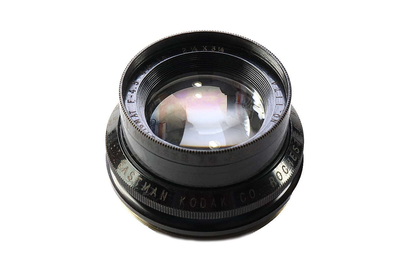 Das wechselbare Objektiv (es gab auch ein passendes Zeiss-Objektiv) mit Schraubanschluss ist beim Museumsmodell ein Kodak Anastigmat 1:4,5/4 1/2 Inch, offenbar speziell für die 2 1/4 x 3 1/4-Kamera, wie die Zusatz-Gravur „2 1/4 x 3 1/4“ vermuten lässt; Seriennummer: 1174.