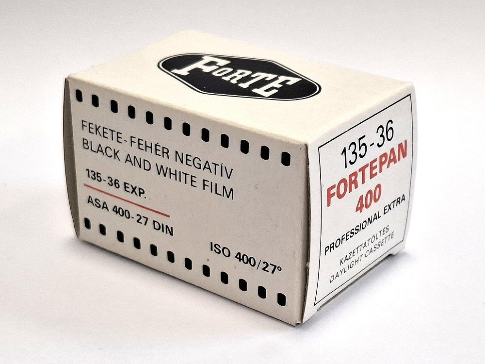 Schwarzweißer Kleinbild-Negativfilm Typ 135, 36 Aufnahmen, ISO 400/27 DIN, keine DX-Kodierung, Negativformat: 24 x 36 mm. Hersteller: Forte, Ungarn. Zu entwickeln vor September 1986.