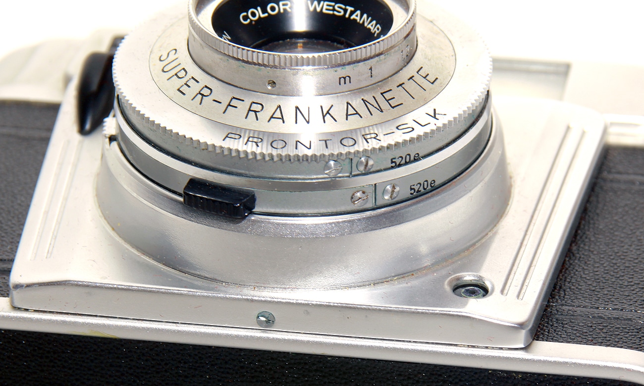 Damit enden aber schon die Gemeinsamkeiten. Die Filmempfindlichkeitseinstellung geschieht hier über ein Rändelrädchen auf der Oberseite hinter der Skala des Belichtungsmessers. Und hier ist ein Prontor-SLK-Verschluss (X/M/Selbstauslöser) mit den Zeiten B, 1 bis 1/300 Sekunde verbaut. Zwar steht auch bei diesem Modell die Bezeichnung „Franka matic“ auf einem dunklen Feld zwischen Sucherfenster und Belichtungsmesserwaben, aber rund um das Objektiv, einem Isco-Göttingen Color-Westanar 1:2,8/45 mm, ist in Großbuchstaben noch „Super-Frankanette“ zu lesen. „Frankaretten“ gibt es von Franka in einigen Versionen, aber eine „Frankanette“? Bis dato noch nie gesehen!