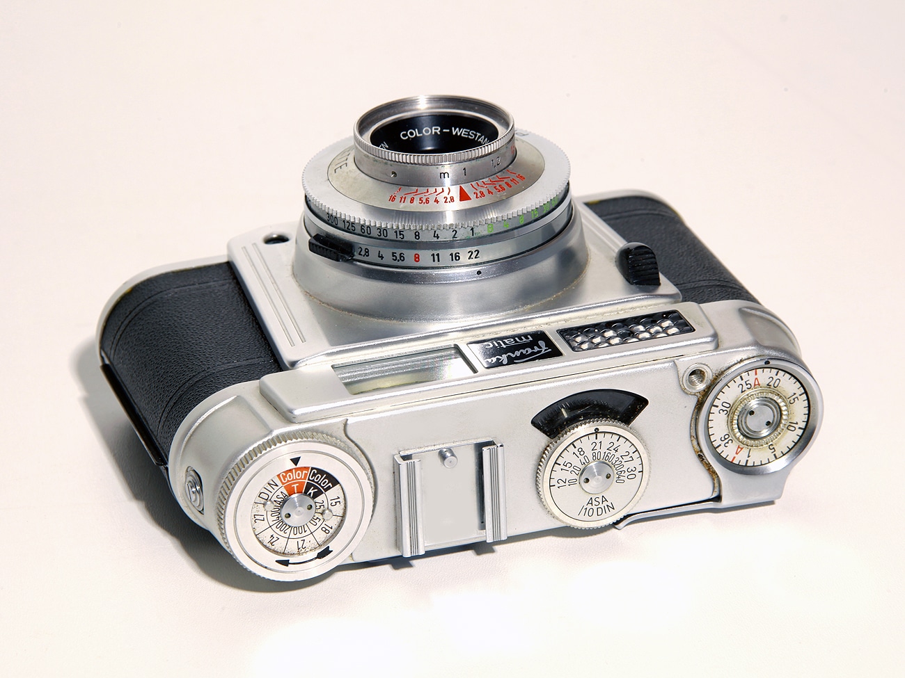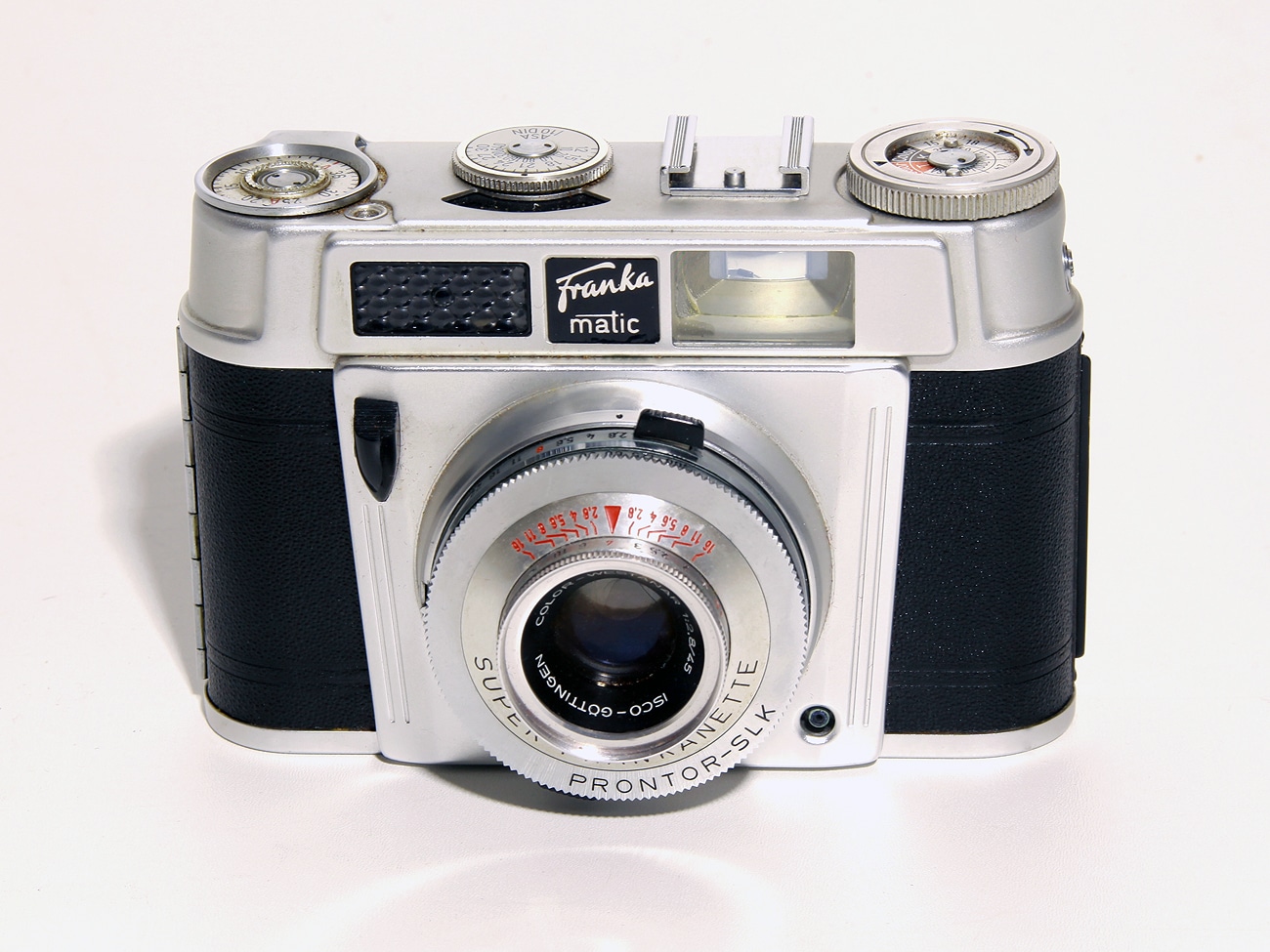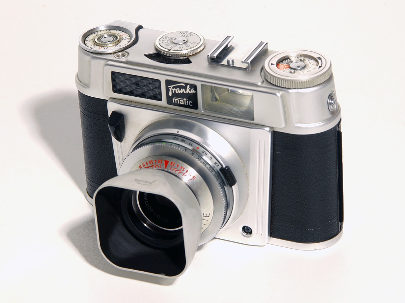 Eine rare Franka-Kleinbildkamera aus Bayreuth, Ende der 1950er Jahre. Im ganzen World Wide Web gibt es nur eine Erwähnung dieses Modells und zwar bei der renommierten Seite Collectiblend. Rein optisch ist das auf den ersten Blick eine nicht gerade seltene Frankamatic II: eine schwere Sucherkamera für den Kleinbildfilm 135 (Aufnahmeformat 24 x 36 mm) aus Bayreuth. Belichtungsautomatik, Entfernungseinstellung mit gekuppelter Schärfentiefenanzeige, Schnelltransporthebel, Nachführbelichtungsmesser mit Integralmessung, Filmmerkscheibe.