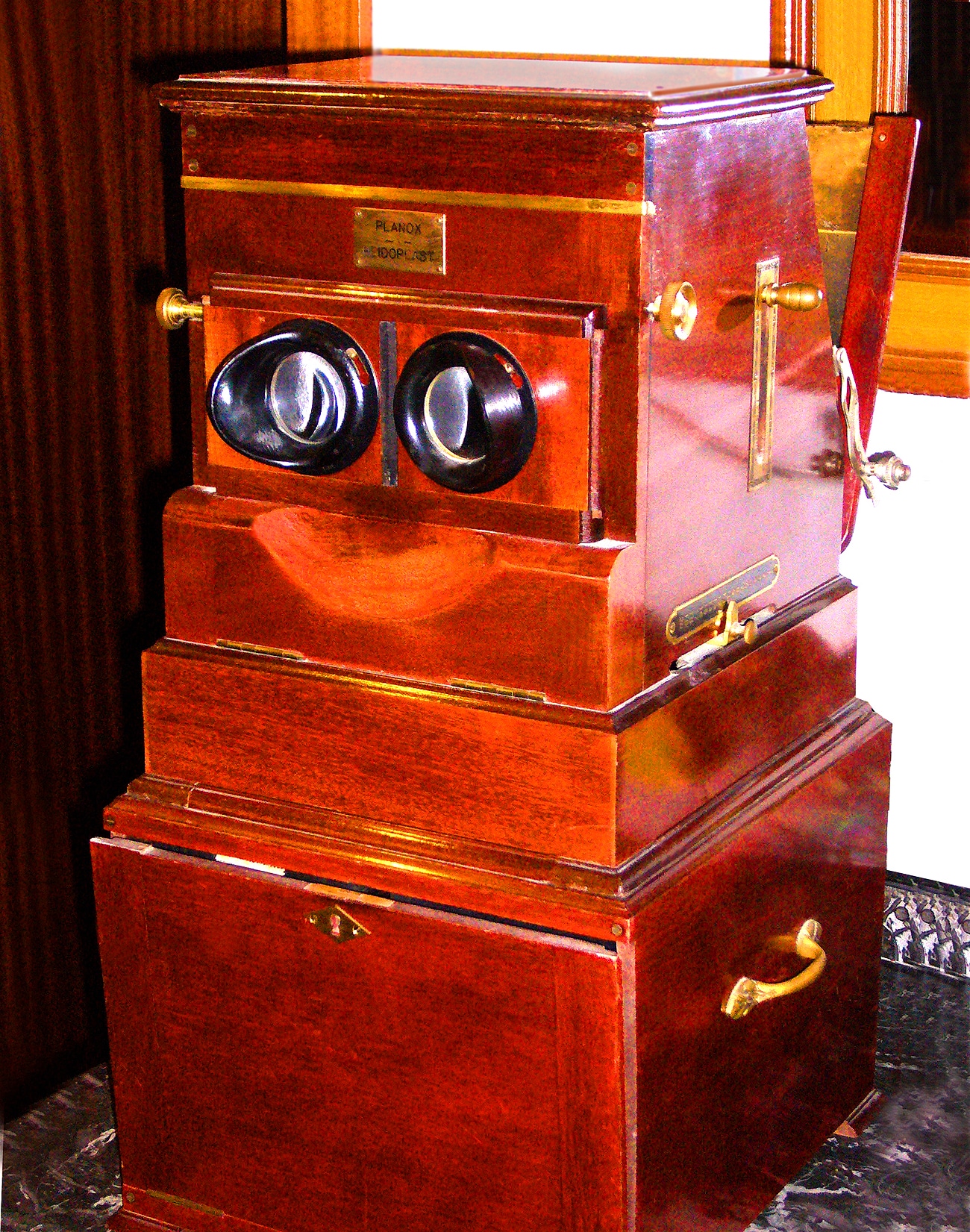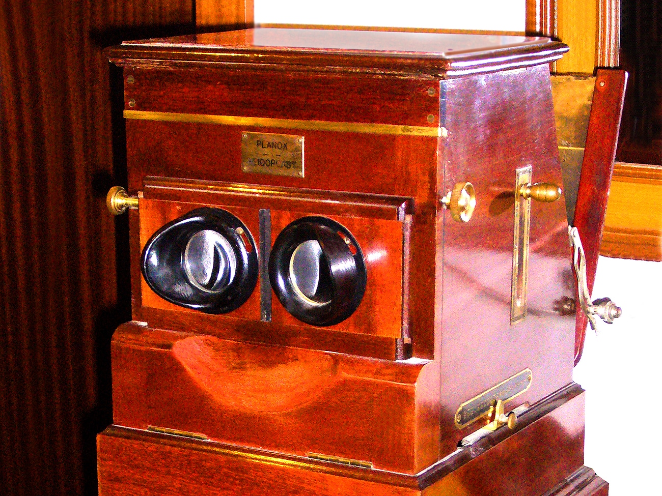 Ein wundervolles Gerät aus den Zwanzigern des vergangenen Jahrhunderts zur serienweisen, halbautomatischen Betrachtung von Stereo-Glasdiapositiven des Negativformats 6 x 13 cm: edles Mahagoni, poliert, raffinierte Mechanik – eine Zierde der Salons vornehmer Bürgerhäuser: das Planox-Heidoplast, vertrieben von Franke & Heidecke (Rollei), hergestellt in Paris bei Planox, weil Rollei keine Erfahrung im Bau diffiziler Holzgehäuse hatte und Geräte aus Metall (die schon fertig konstruiert waren) zu teuer gekommen wären. Das Holzgehäuse besteht aus einem Oberteil mit der Mechanik, aufgesetzt auf einen etwa würfelförmigen Kasten, der vorne eine Klappe hat und der sechs Magazine beherbergt. Ein Magazin mit maximal 20 Stereo-Fotos befindet sich in der Regel noch oben im Gerät.