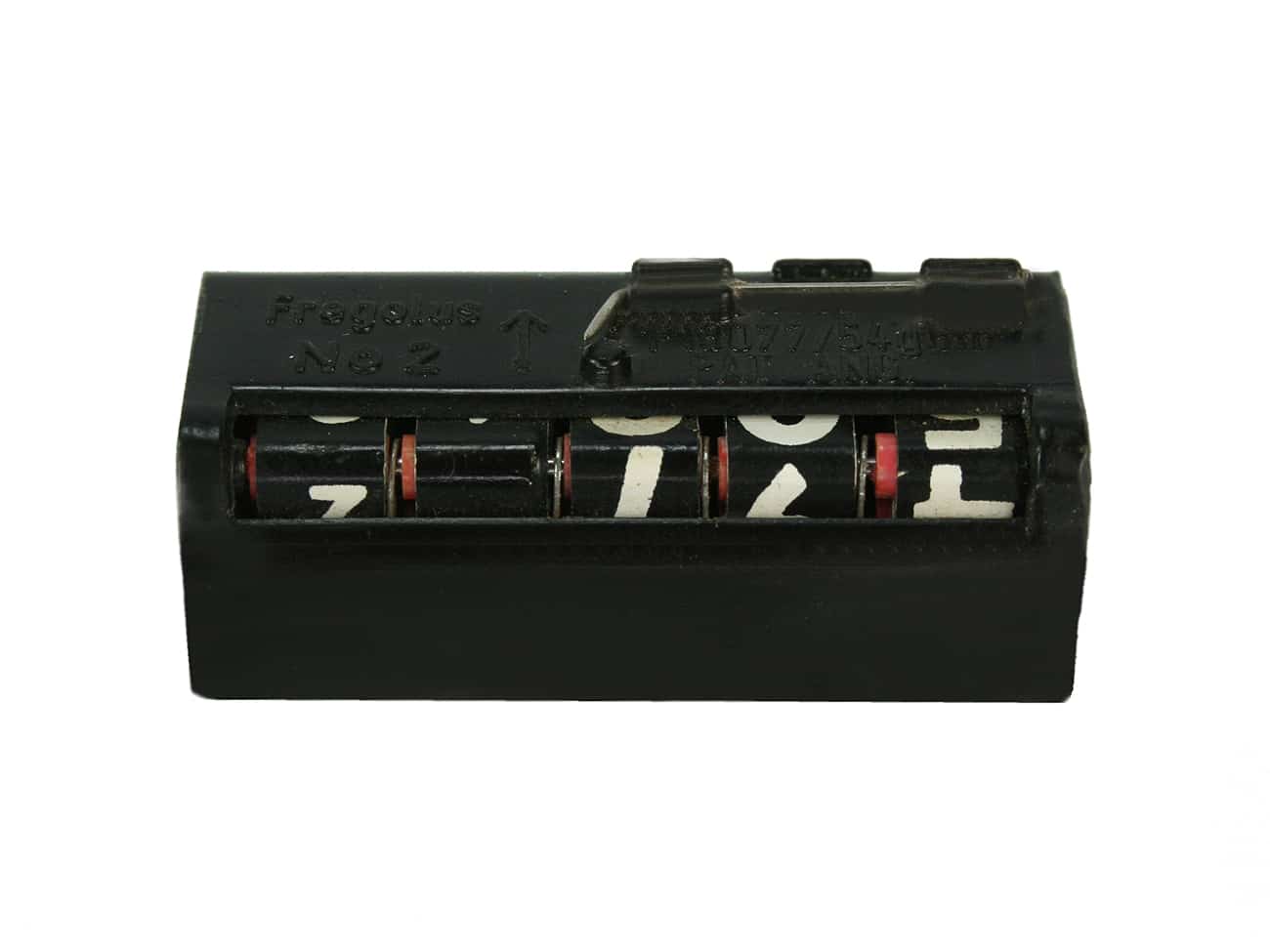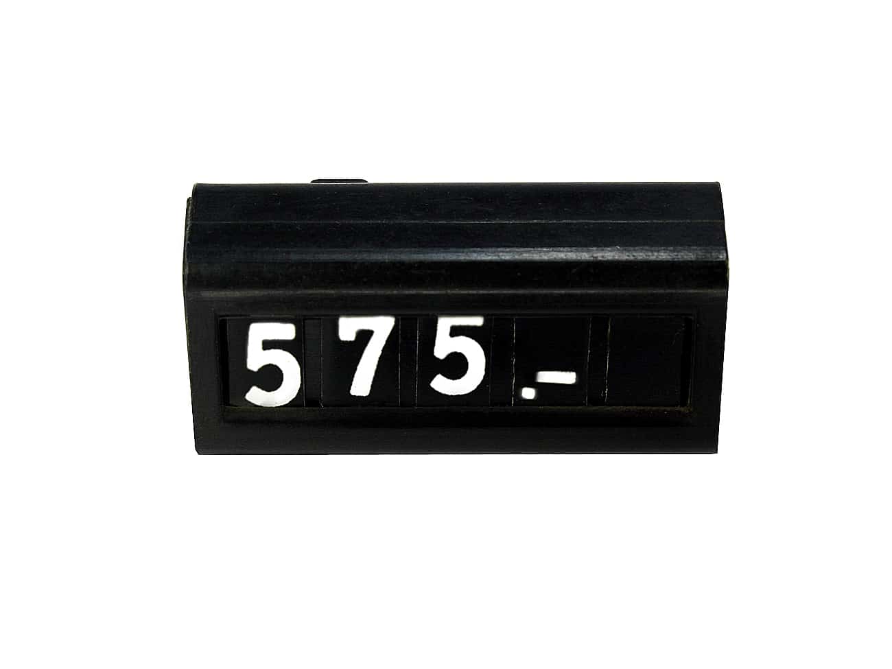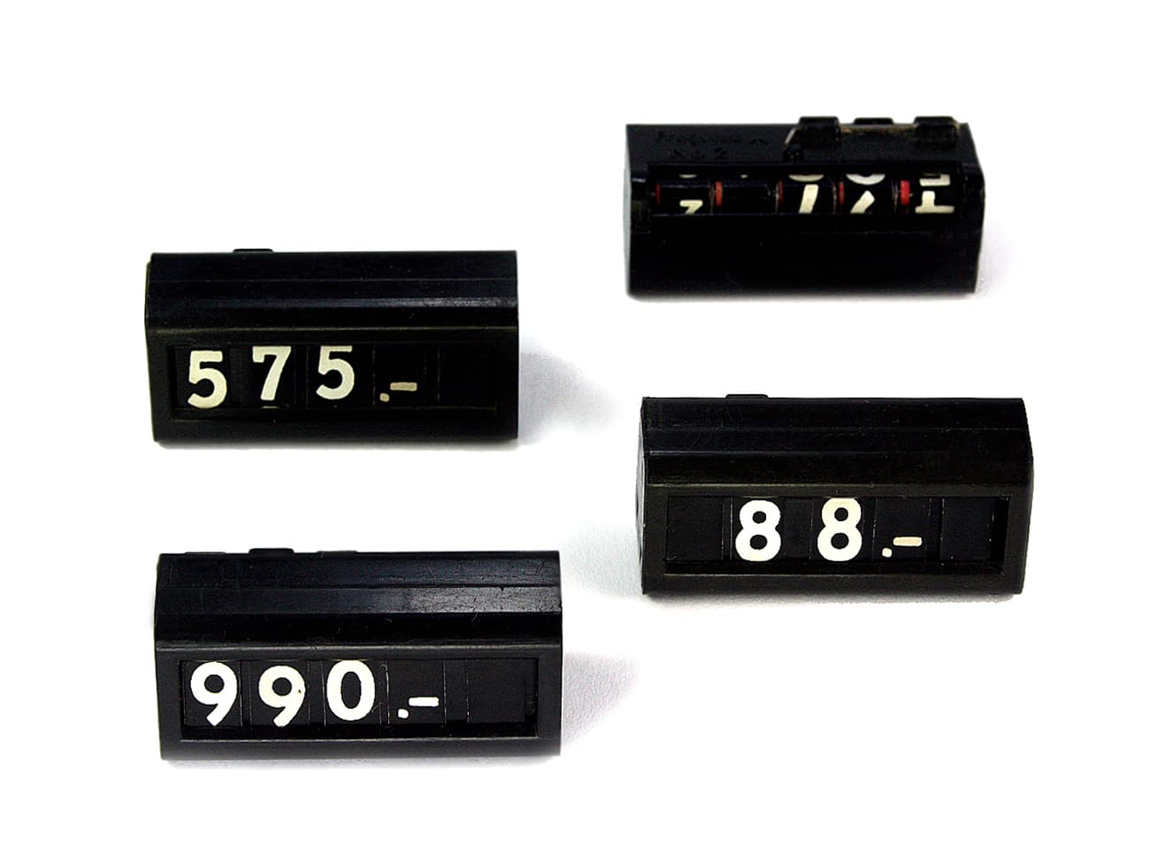 Das waren wenigstens noch Preisschilder in der guten alten Zeit: etwa 4,3 x 2 x 1,6 Zentimeter große Kunststoffkästchen mit jeweils fünf Rädchen, die die Preise wie auf einer der damals beliebten Digitaluhren anzeigen konnten. Die Dinger hießen „Fregolus No. 2“, das Patent war „angemeldet“. Vermutlich 1970er/1980er Jahre.