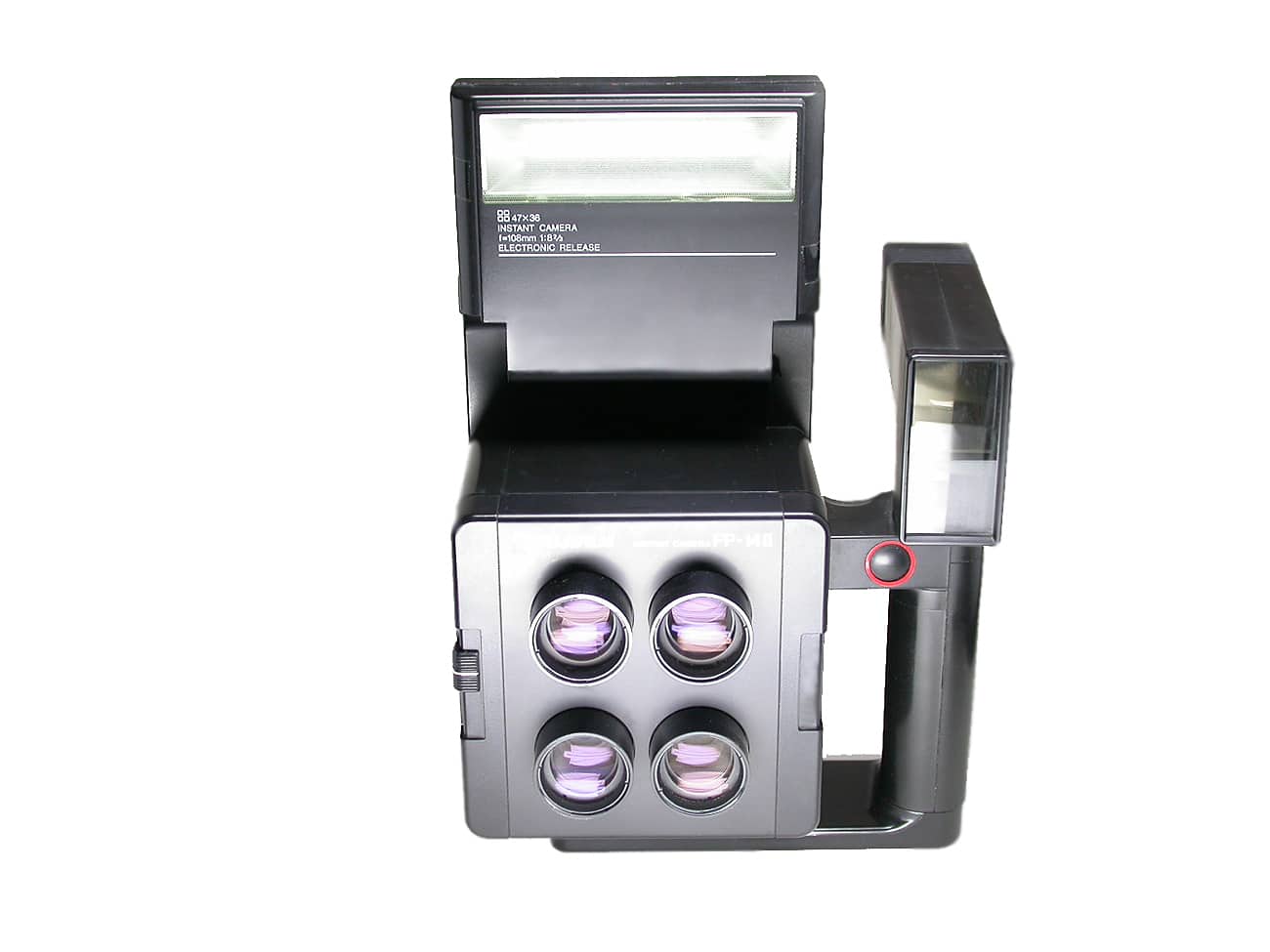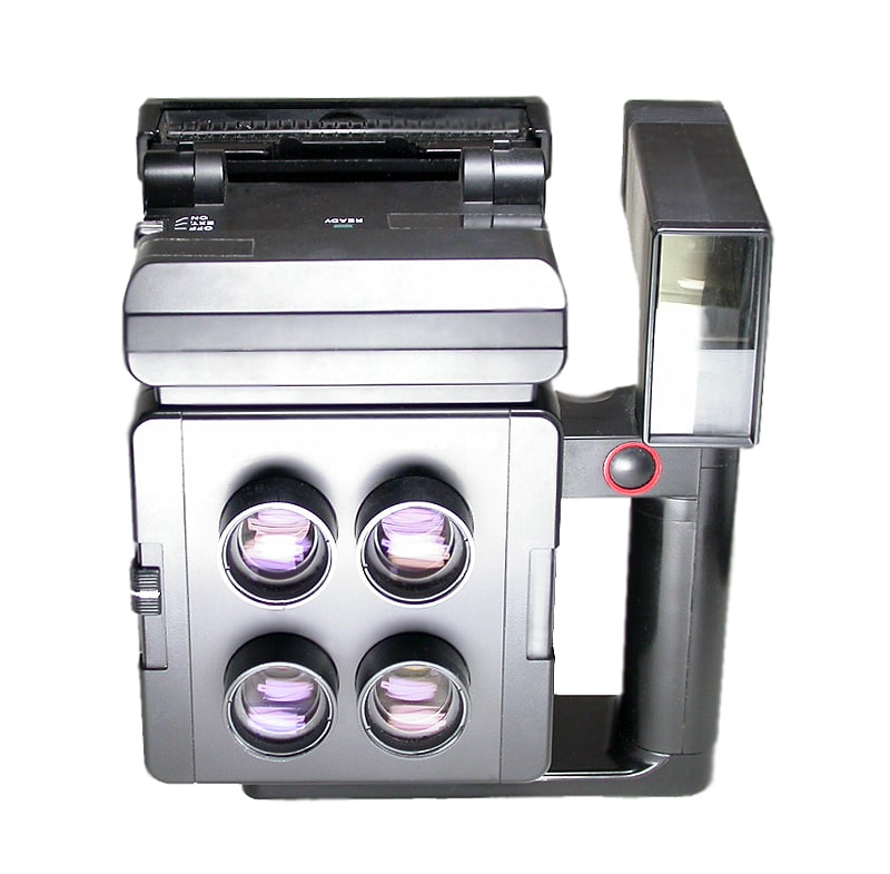 Passbildkamera (1990er Jahre) für Fuji-Sofortbildmaterial PA 24 – Filme: FP-100 C, FP-100 C-Silk (seidenmatt), FP-3000 B Super Speedy (36 DIN, Schwarzweiß) oder FP-100 B Super (Tageslicht-SW-Film) oder Polaroid-Äquivalente. Vier Objektive (Dreilinser aus Glas mit 108 mm) heißt: vier Aufnahmen gleichzeitig bei 1/60 Sekunde. Die Entfernung ist fest auf 2 Meter eingestellt, der Blendenbereich geht von 8,6 bis 64. Der ausklappbare Blitz mit Leitzahl 15 machte von Zusatzbeleuchtung unabhängig. Es gibt aber einen zusätzlichen X-Blitzanschluss. Buchse für externe Stromversorgung, Stativgewinde, Sucher im Handgriff eingebaut.