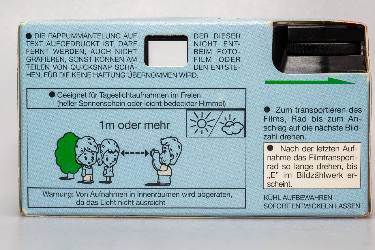 Einwegkamera für den Kleinbildfilm 135 (Aufnahmeformat 24 x 36 mm), hergestellt in Japan. Objektiv: ohne Angaben, Fixfokus; Newton-/Fernrohrsucher. Einfachverschluss. Beförderung des Films durch Transportrad. Eingelegter Film: 12+3 Aufnahmen, zu entwickeln bis 06/1999, Entwicklungsprozess CN-16 oder C-41. Kunststoffgehäuse, darüber eine Pappummantelung mit Werbeaufdruck: „Staffware workflow … Simply the Best. Operation Workflow“. Gebrauchsanleitung auf der Rückseite.