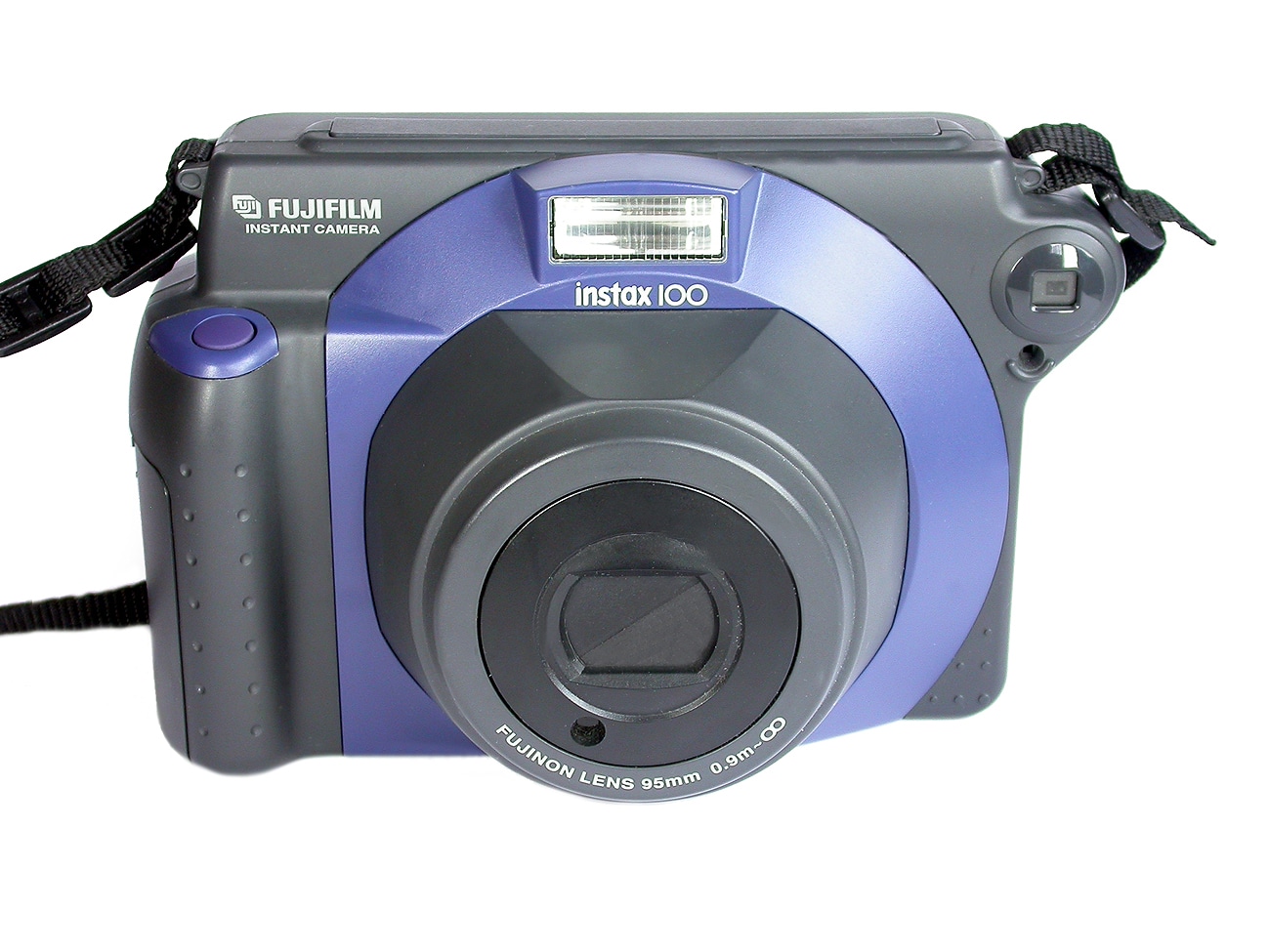 Moderne Sofortbildkamera von Fuji, Japan. Eine der wenigen Sofortbildkameras, die nicht von Polaroid kommt. „Wide picture Format“ (62 x 99 mm; 10 Aufnahmen je Film); Objektiv Fujinon 1:14/95 mm, elektronischer Programmverschluss 1/64 bis 1/200 Sekunde., Schärfeeinstellung mit zwei Entfernungseinstellungen: 0,9 bis 3 Meter und 3 Meter bis unendlich. Motorisierte Bildausgabe, eingebauter E-Blitz. Made in China, 1999. Stromversorgung: 4 x Mignon-Batterien AA.