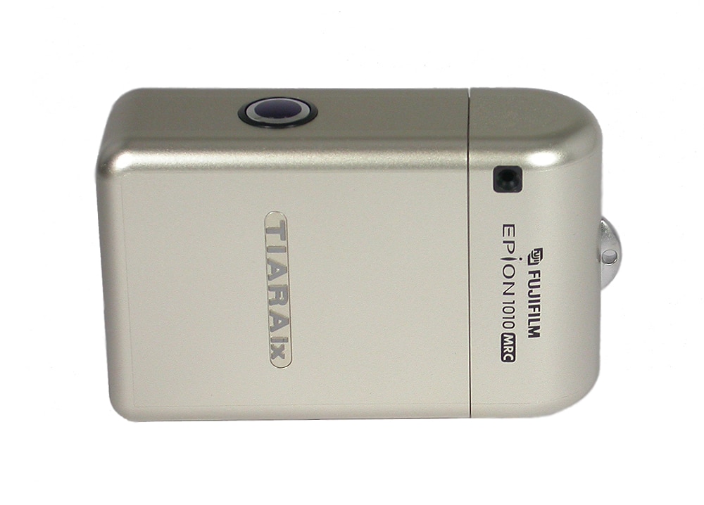 Wunderschöne APS-Kamera von Fuji Photo Film, Japan (Made in Indonesia), 1999. „Champagnergoldmetallic“ würde man bei einem Auto sagen. Eingeschoben misst das Gehäuse nur 85 x 55 x 30 mm, durch Auseinanderziehen der beiden Gehäuseteile auf 110 mm wird die Kamera aufnahmebereit, das Objektiv Super EBC Fujinon 1:3,5/24 mm (drei Elemente in drei Gruppen) fährt dabei automatisch aus. Verschluss: programmgesteuert 1/2 bis 1/500 Sekunde, stufenlose automatische Belichtungsteuerung, Filmempfindlichkeiten ISO 25 bis ISO 3.200. Infrarot-Autofokus. Automatischer motorischer Filmtransport. Rückspulung auch mitten im Film und Filmpatronenaustausch vor Filmende möglich. Ausklappbarer Blitz mit Rote-Augen-Reduziermodus. Printformate: C/H/P, umschaltbar. Datenaufzeichnung auf jedem Bild (Datum, Printtyp, Bildqualitätsverbesserung). Auf der Gehäuserückseite: Vierfach-Wippe für Blitzmodus, Formatwahl, Selbstauslöser, Filmwechsel vor Ende; Anzeigefenster für Bildzähler.