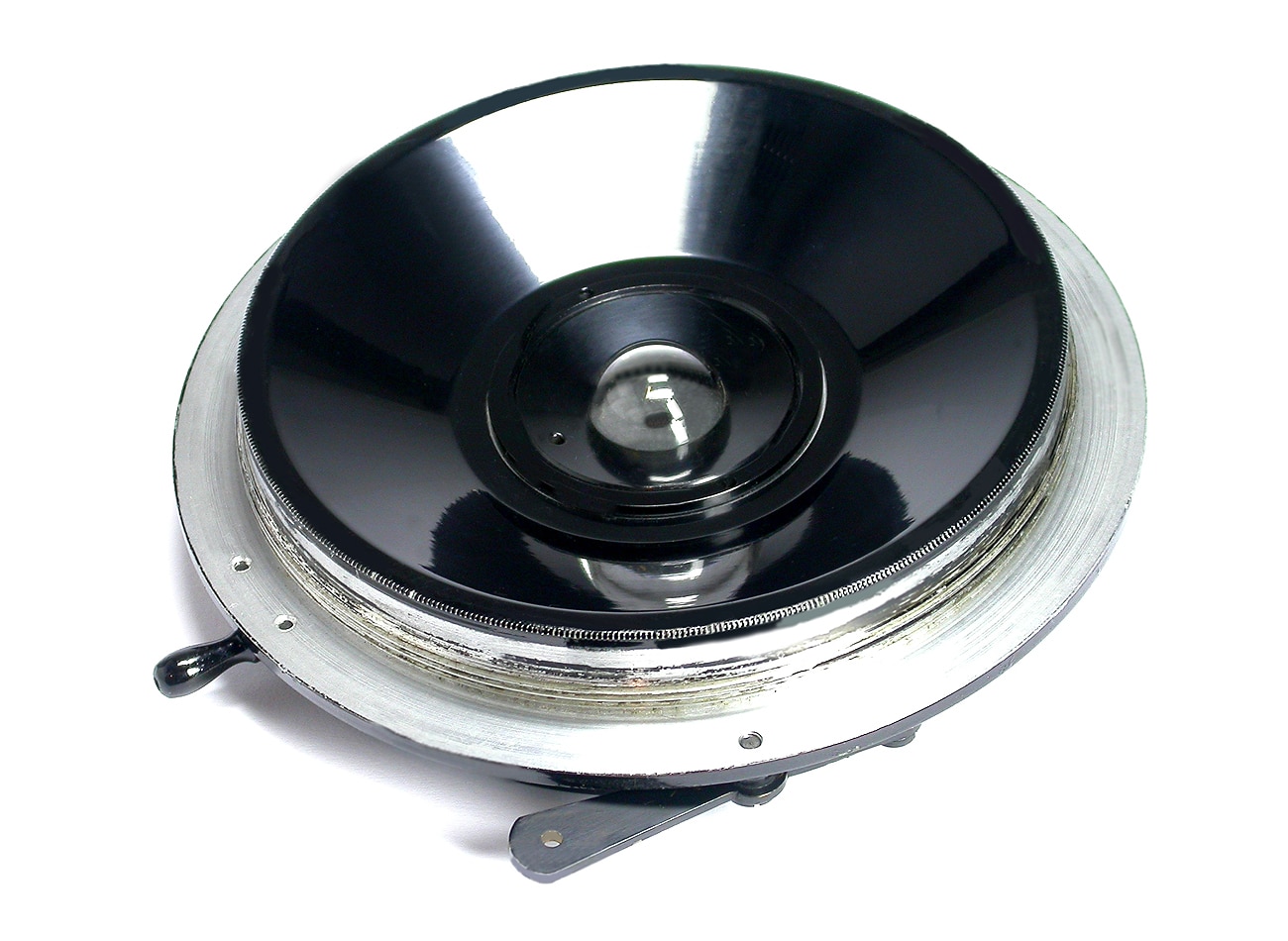 Das Hypergon wurde um 1900 von Emil von Hoegh errechnet und konstruiert und besteht aus zwei spiegelsymmetrischen, stark meniskusförmigen Linsen, die bei kleiner Blende (hier: 1:48 oder 1:96) eine hervorragende Bildqualität bei einem Bildwinkel von rund 135 Grad ergeben. Der starke Lichtabfall am Bildrand (Vignettierung) wurde durch eine rotierende Maske kompensiert (Bild, Mitte), die durch Druckluft angetrieben wurde. Dazu wurde an den Stutzen eine Art Blasebalg mittels eines Gummischlauchs angeschlossen. Ein schnelles Zusammendrücken des Ballons kurz vor der Auslösung versetzte die rotierende Maske in Bewegung, was zur Abschattung der zentralen Bildteile und damit Angleichung an die äußeren Negativflächen führte.