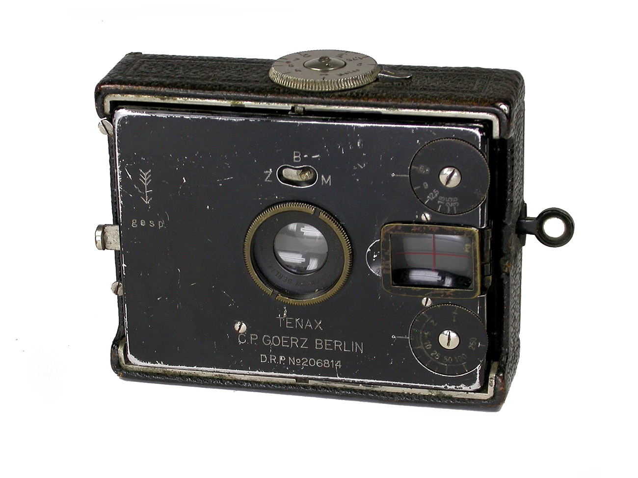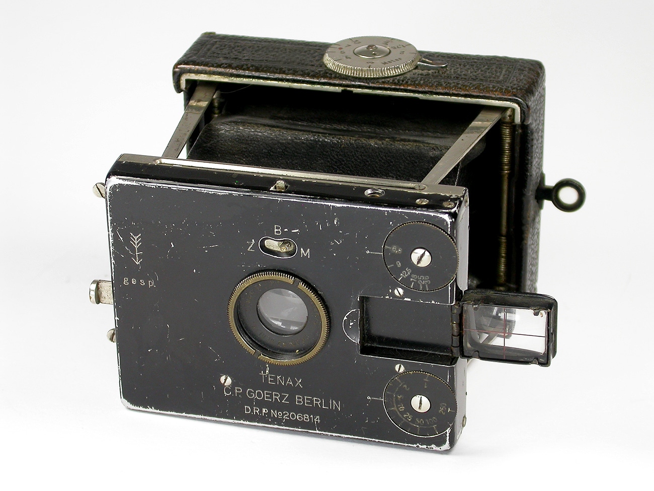 Spreizenkamera, bekannt als „Westentaschen-Tenax“, für Platten oder Filmpacks (Aufnahmeformat 4,5 x 6 cm), hergestellt ab 1908 von C. P. Goerz, Berlin. Objektiv: Goerz Tenaxiar 1:6,8/75 mm; manuelle Fokussierung (das Stellrad hinten oben Mitte). Die Kamera war auch mit den Goerz-Objektiven Celor 1:4,5/75 mm, Dagor 1:6,8/75 mm, Syntor 1:6,8/75 mm oder Synthor 1:6,8/10 cm erhältlich. Aufklappbarer Newtonsucher. Mechanischer Zentralverschluss (Z, B, 1/2 bis 1/250 Sekunde); manuelle Belichtungssteuerung.