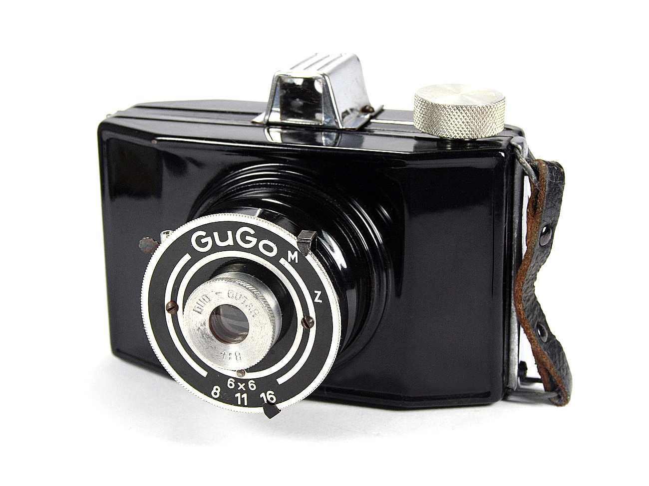 „Die Gugo Knips 6 x 6 wird sicher rasch viele Freunde finden. Sie besitzt alle Eigenschaften einer guten Box ohne deren Nachteil: die Größe des kastenförmigen Gehäuses. GuGo-Knips hat optischen Durchsichtssucher, Moment- und Zeitverschluss mit Drahtauslöser-Einschraubvorrichtung. Das scharfzeichnende Duo-Gutar 1:8 ist bis 1:16 abblendbar. Panfilmschiebefenster, Stativmutter und sehr praktische Filmeinlegevorrichtung. Preis: 14,70 DM.“
