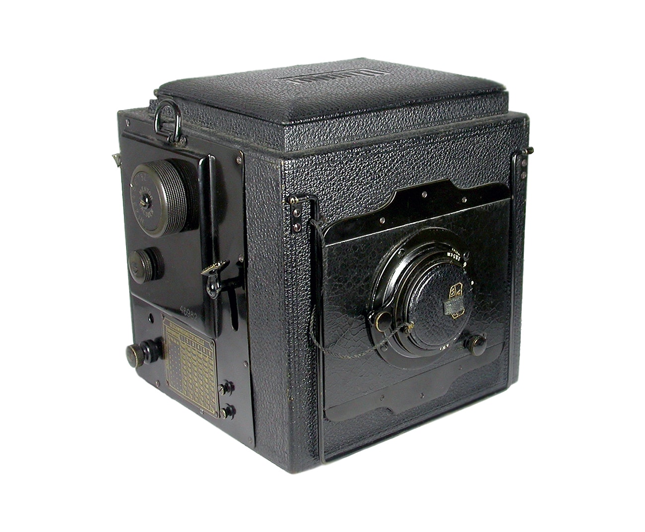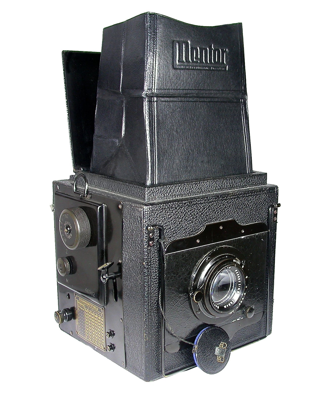 Großformatkamera für Platten oder Filmpacks, Spiegelreflex mit mechanischem vertikal laufenden Schlitzverschluss. Holzkorpus mit Lederbezug. Keine Auszugsverlängerung. Objektivplatte um die eigene Achse drehbar. Rahmensucher, SLR-Sucher. Wechselobjektive, hier mit Carl Zeiss Jena Tessar 1:4,5/13,5 cm in Schneckengangfassung (kleinste Blende: 36, kürzeste Einstellentfernung: 1,5 Meter). Hersteller: Mentor-Kamerafabrik Goltz & Breutmann, Dresden, Baujahr unbekannt, vom Typ her vermutlich zwischen 1900 und Ende der 1920er Jahre.