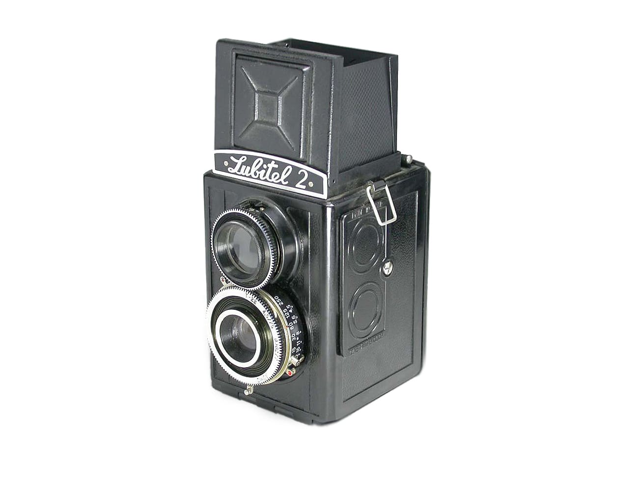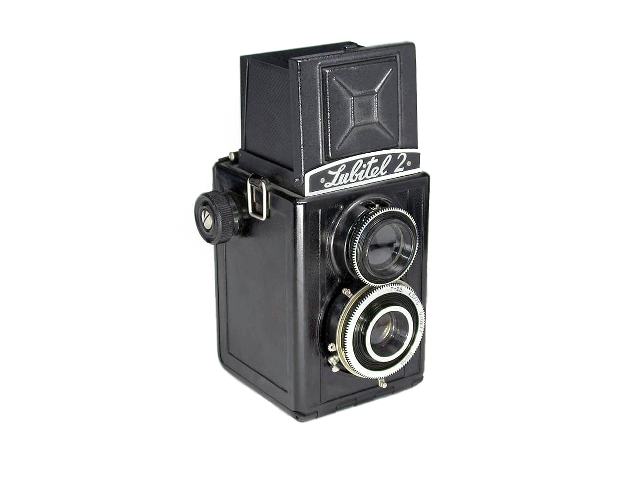 Russische zweiäugige Spiegelreflexkamera (1955 bis 1980) für den Rollfilm 120/620/B 2 (Aufnahmeformat 6 x 6 cm). Manuelle Fokussierung, Lichtschachtsucher, mechanischer Zentralverschluss bis 1/250 Sekunde, manuelle Belichtungssteuerung, Objektiv: 1:4,5/75 mm.